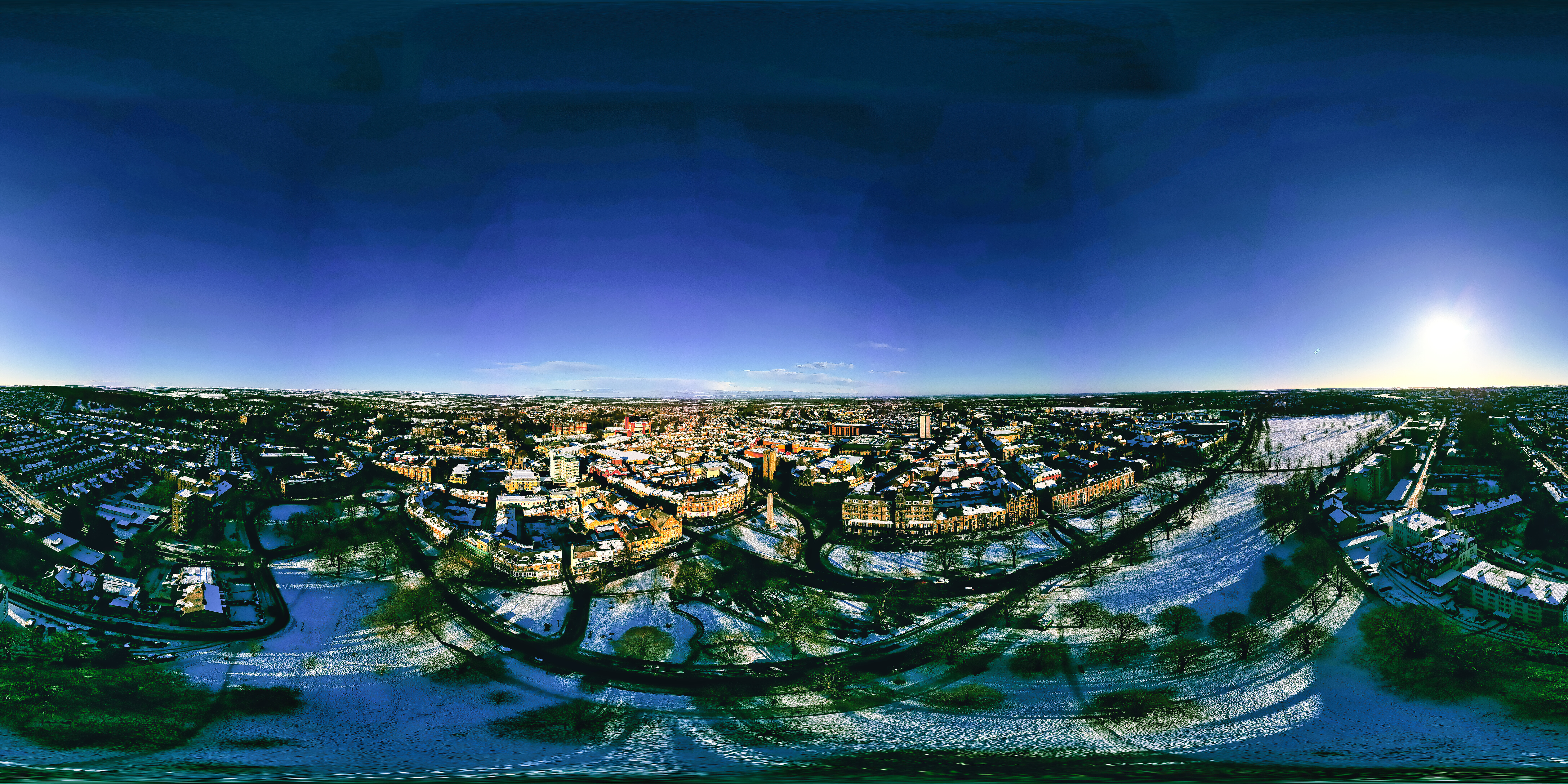 Aerial 360 view of a snow-covered town under a clear blue sky. Residential buildings, parks, and roads are visible. The sun shines brightly in the upper right corner in Harrogate, UK.
