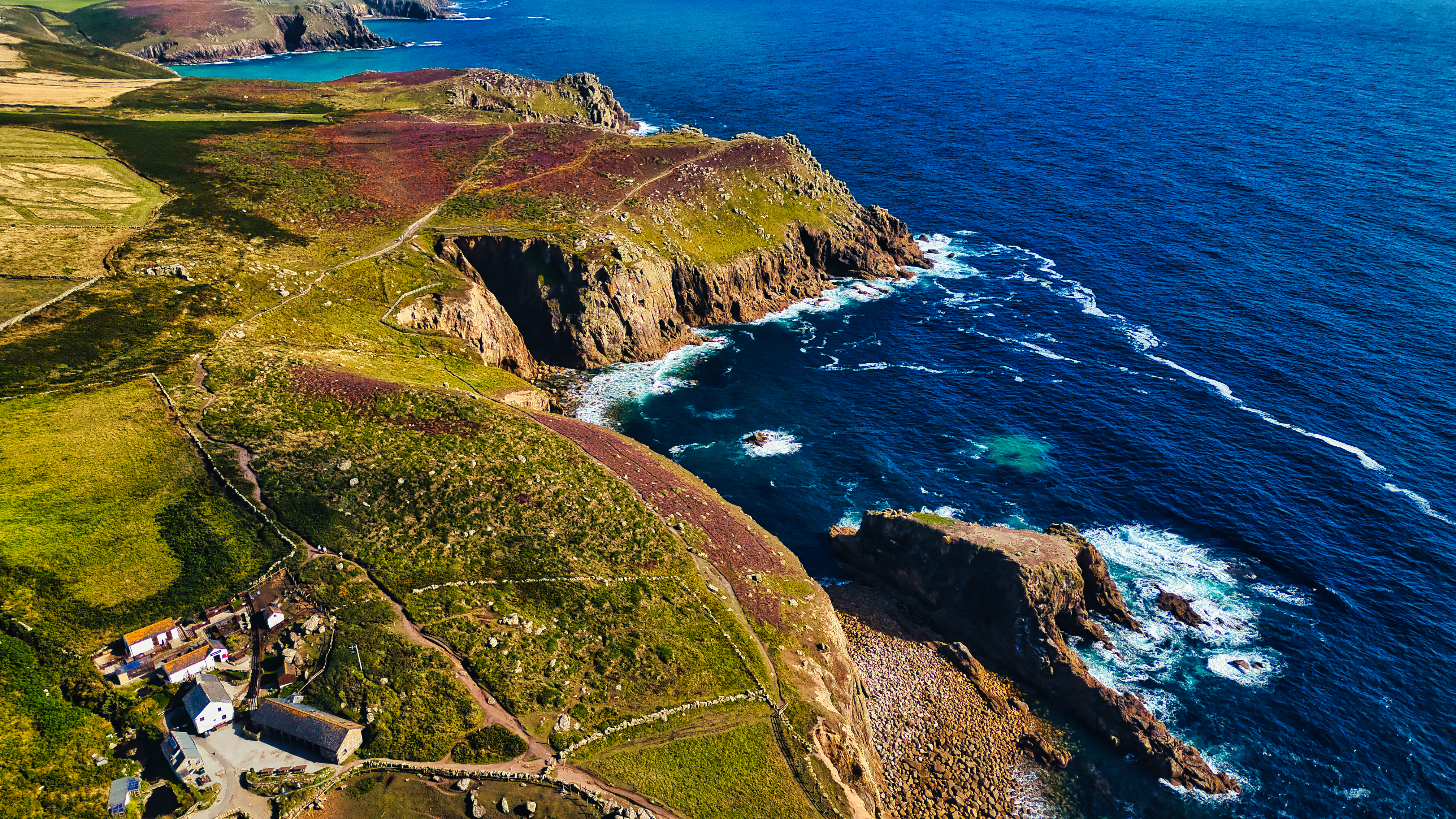 Aerial view of a rugged coastline with cliffs and vibrant green and purple vegetation. The blue ocean waves crash against the rocky shore, creating a picturesque landscape. A small settlement with white buildings is visible near the coast.