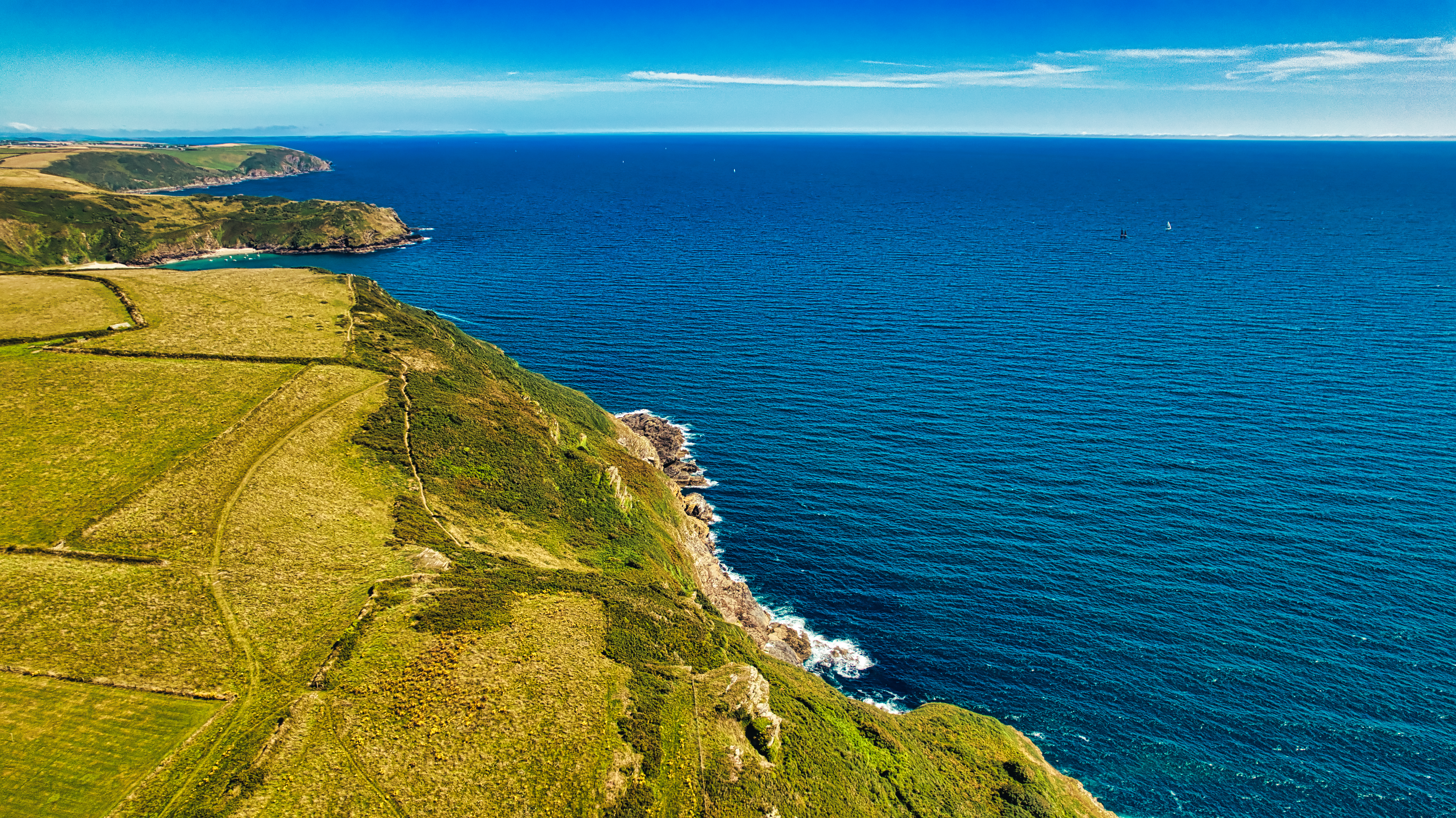 Aerial view of a coastal landscape featuring green fields and cliffs meeting the blue ocean. The horizon is clear with a few boats visible in the distance, showcasing a serene and picturesque natural setting.