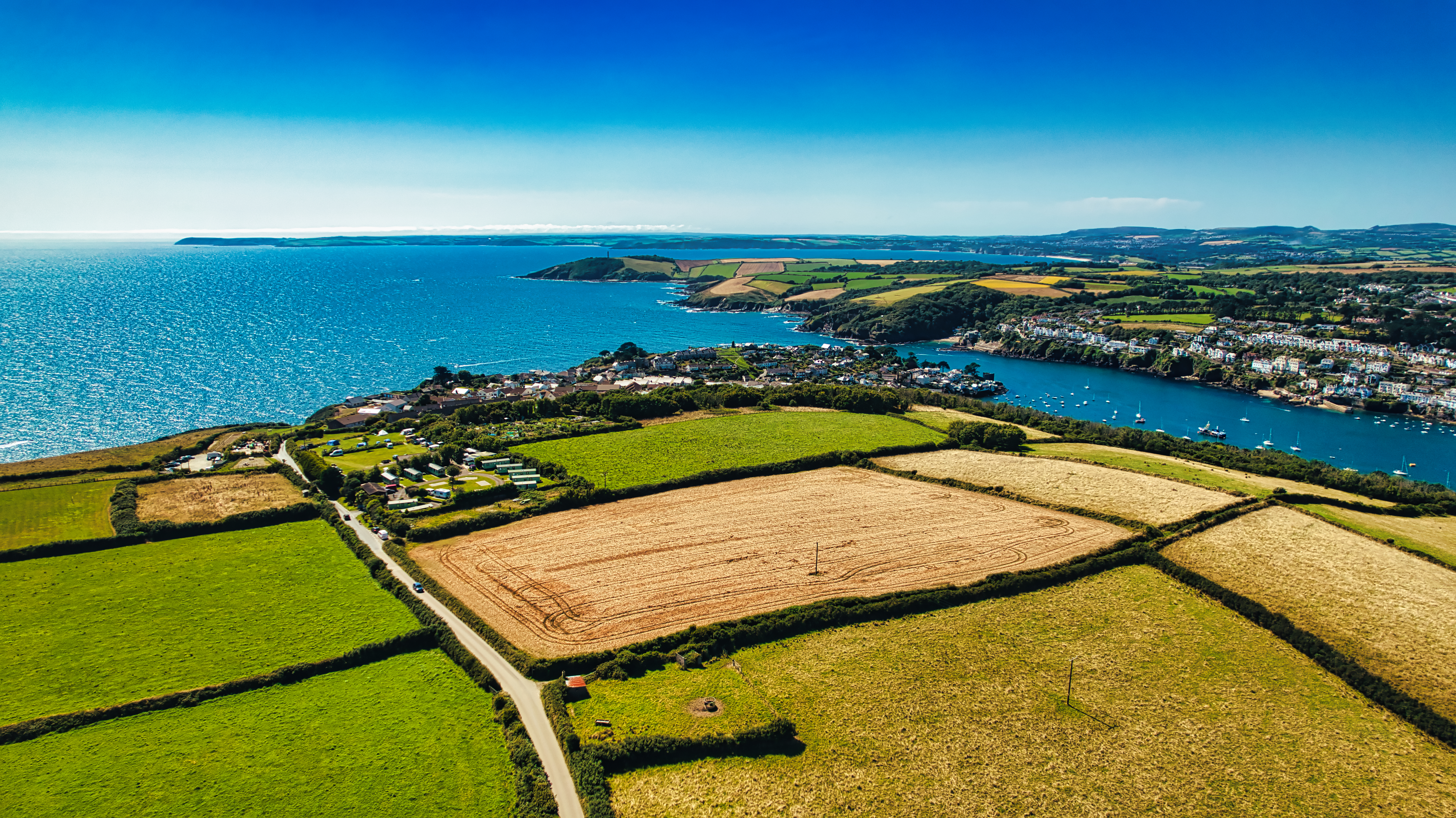 Aerial view of a coastal landscape featuring fields, a river, and a small town by the sea. The scene showcases vibrant green fields, a golden harvested field, and a blue ocean with boats. The horizon is clear, indicating a sunny day.
