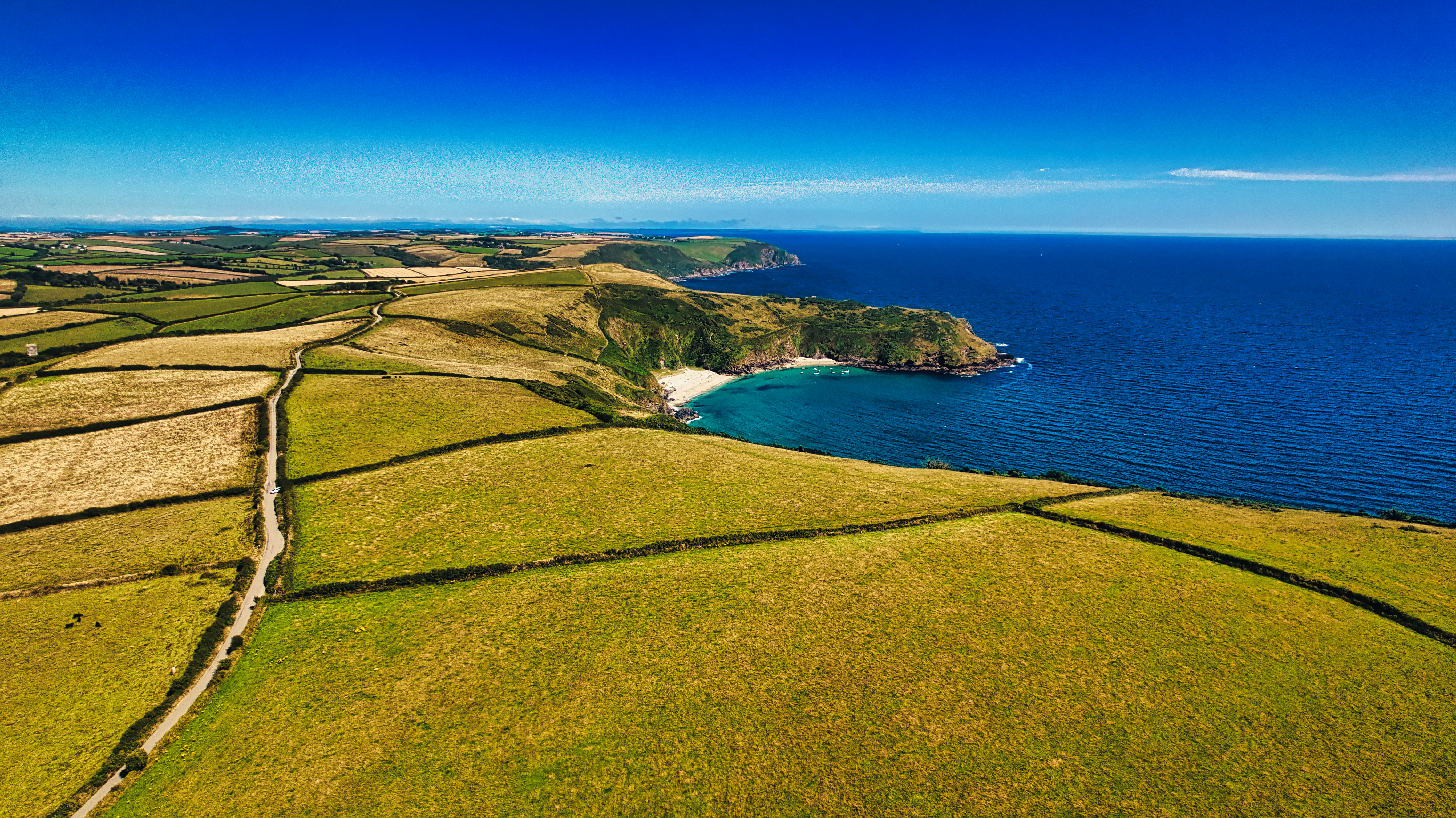 Aerial view of a coastal landscape featuring lush green fields, a serene blue sea, and a small sandy beach nestled in a cove. The horizon is clear with a bright blue sky, showcasing the beauty of nature.
