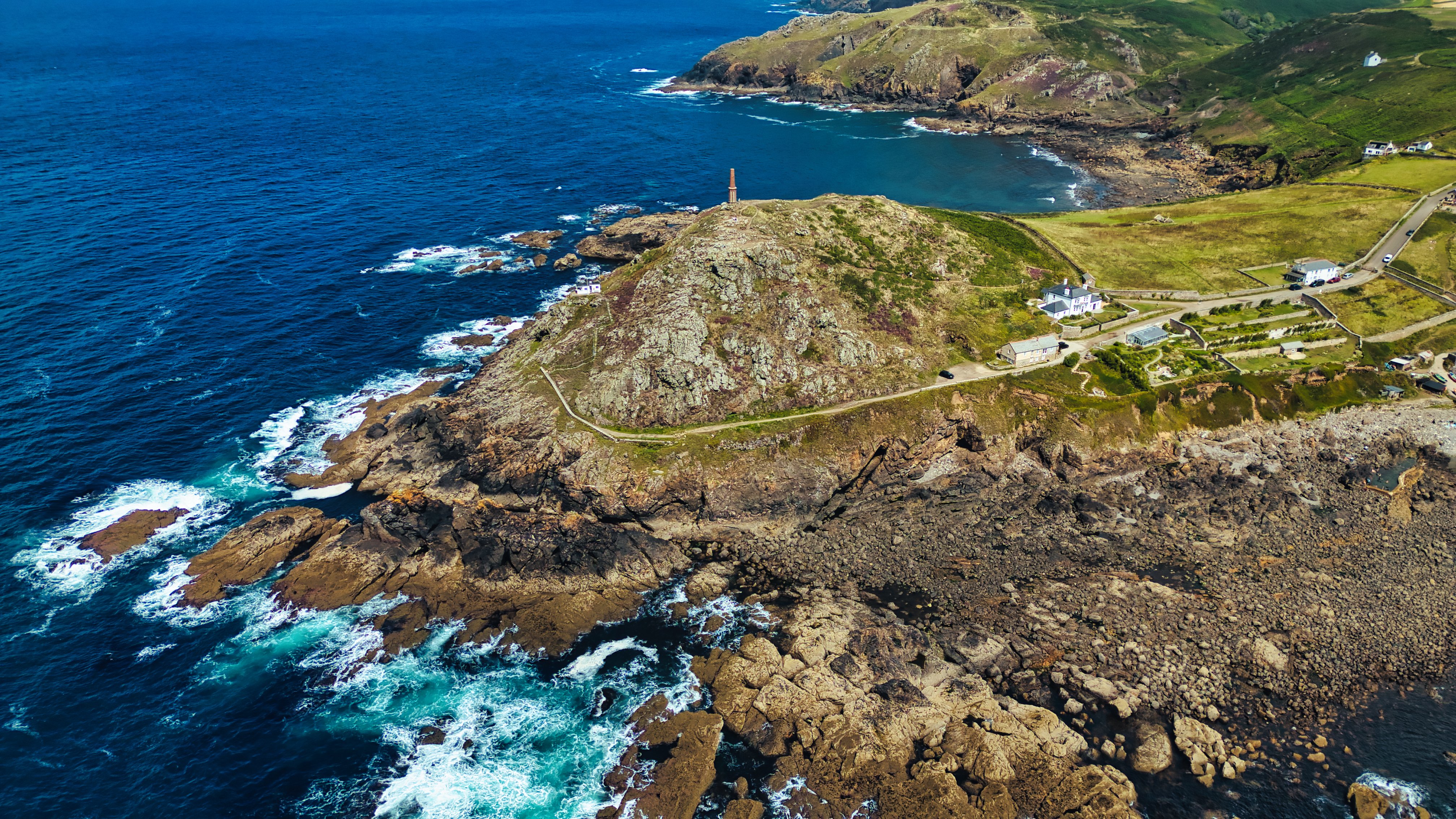 Aerial view of a coastal landscape featuring rocky shores, a lighthouse on a hill, and lush green hills in the background. The ocean waves crash against the rocks, creating a scenic and tranquil atmosphere.