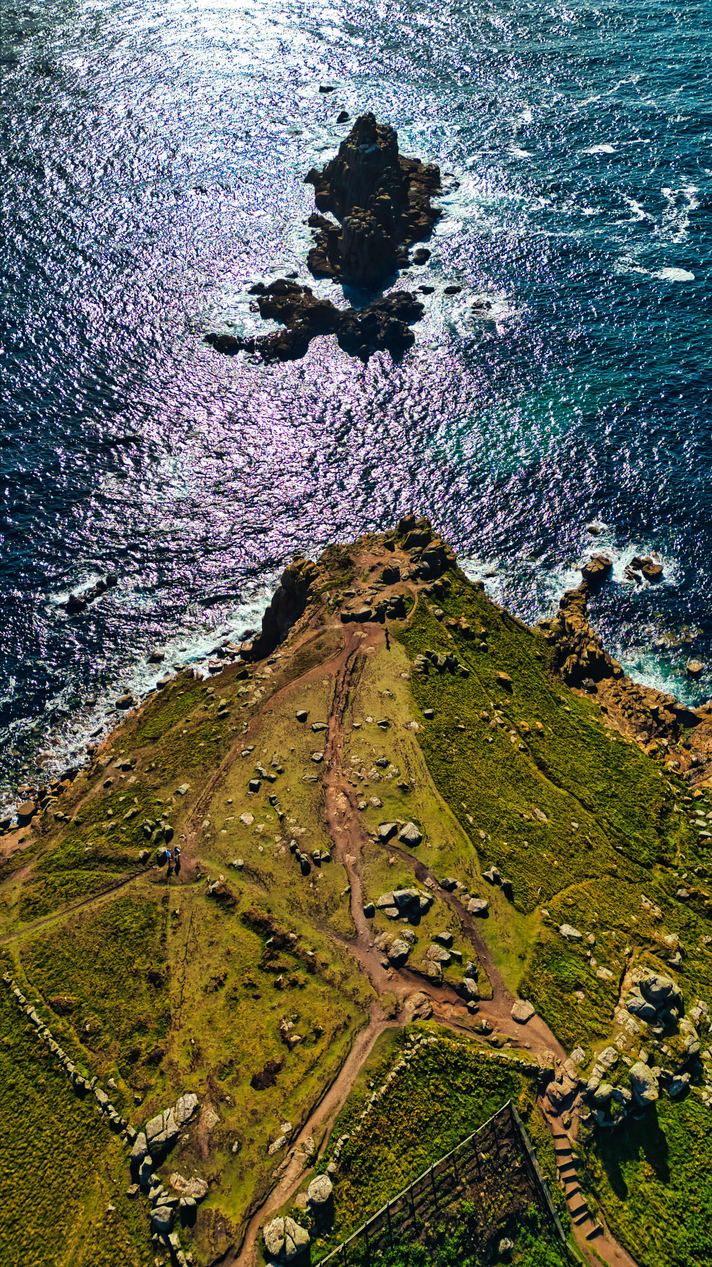 Aerial view of a coastal landscape featuring rocky formations and lush greenery. The shimmering ocean reflects sunlight, creating a scenic contrast with the rugged terrain. Paths wind through the landscape, leading to the rocky outcrop in the distance.