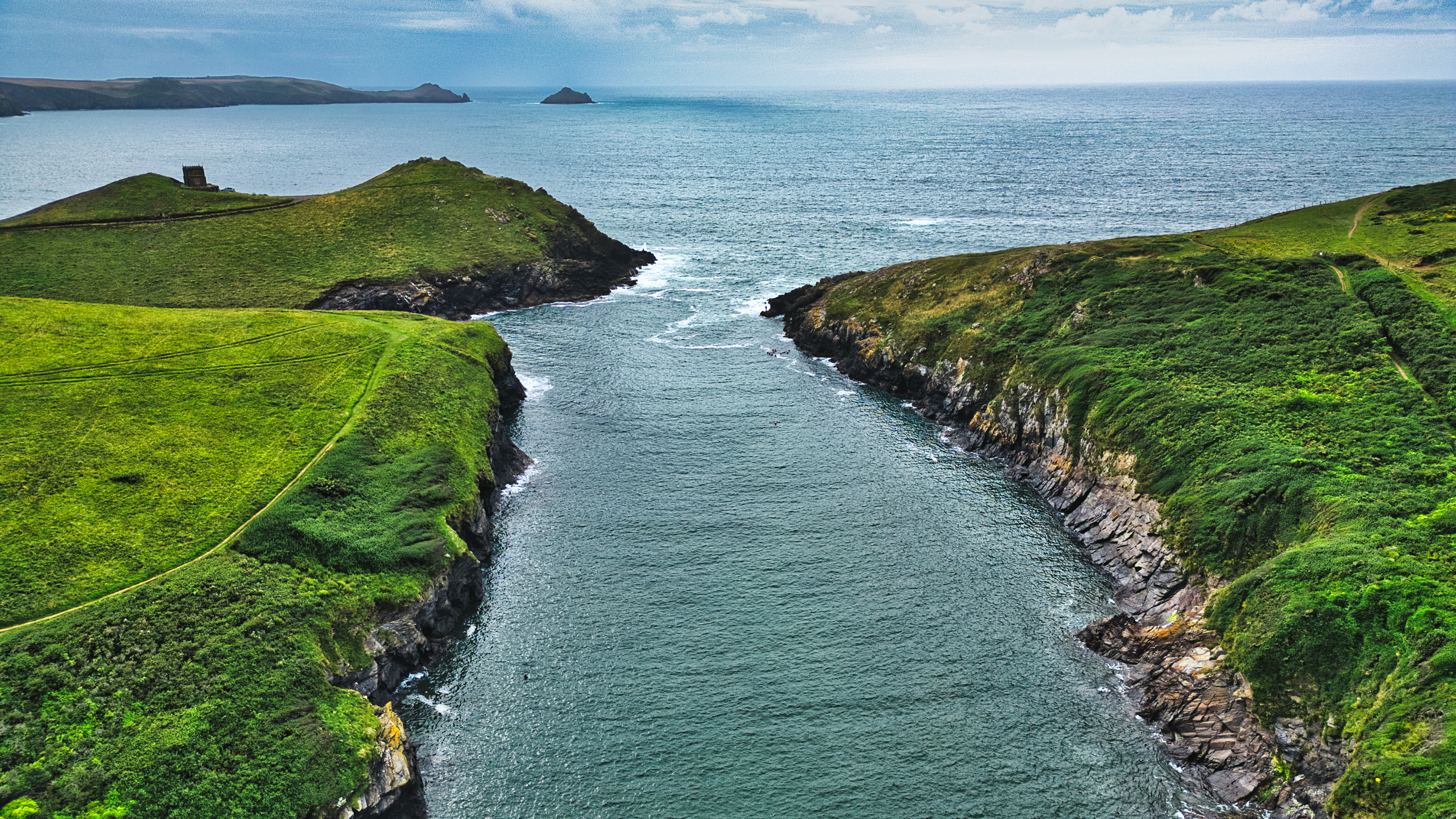 Aerial view of a serene coastal landscape featuring green hills, a narrow waterway, and the ocean in the background. The scene captures the beauty of nature with rocky cliffs and lush vegetation.