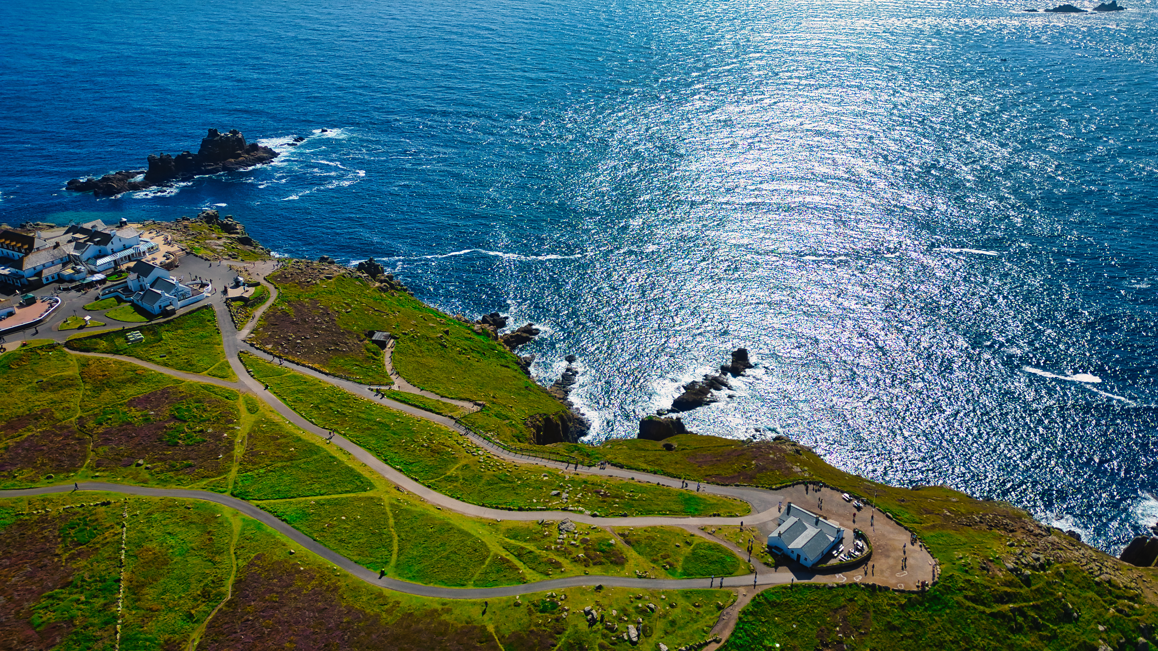 Aerial view of a coastal landscape featuring green hills, winding paths, and a sparkling blue ocean. Small buildings are visible near the shore, with rocky outcrops in the water. The scene captures the beauty of nature and coastal living.