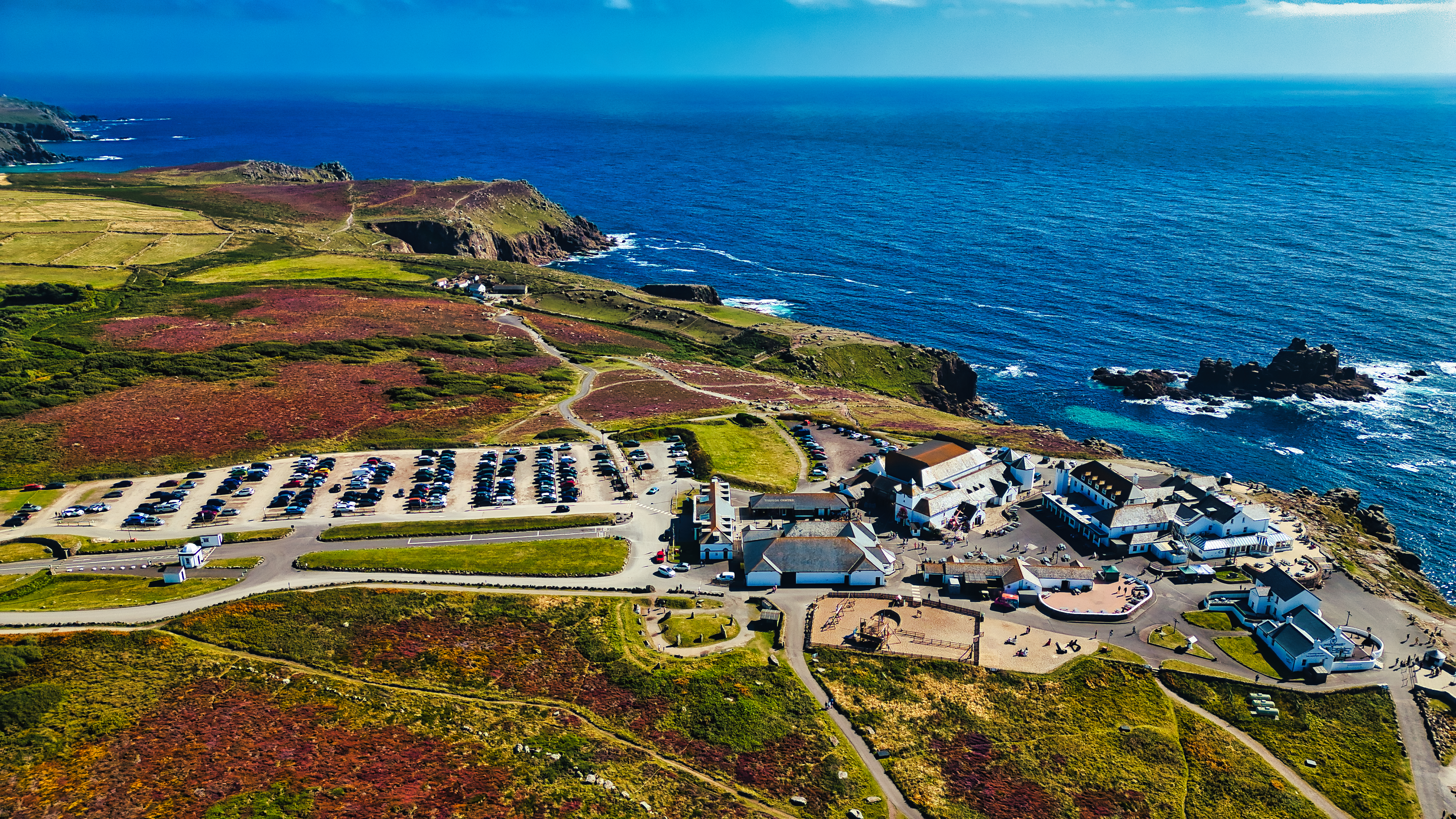 Aerial view of a coastal area featuring a parking lot, buildings, and rocky coastline. The landscape is lush with greenery and colorful vegetation, contrasting with the deep blue ocean. Clear skies enhance the scenic beauty.