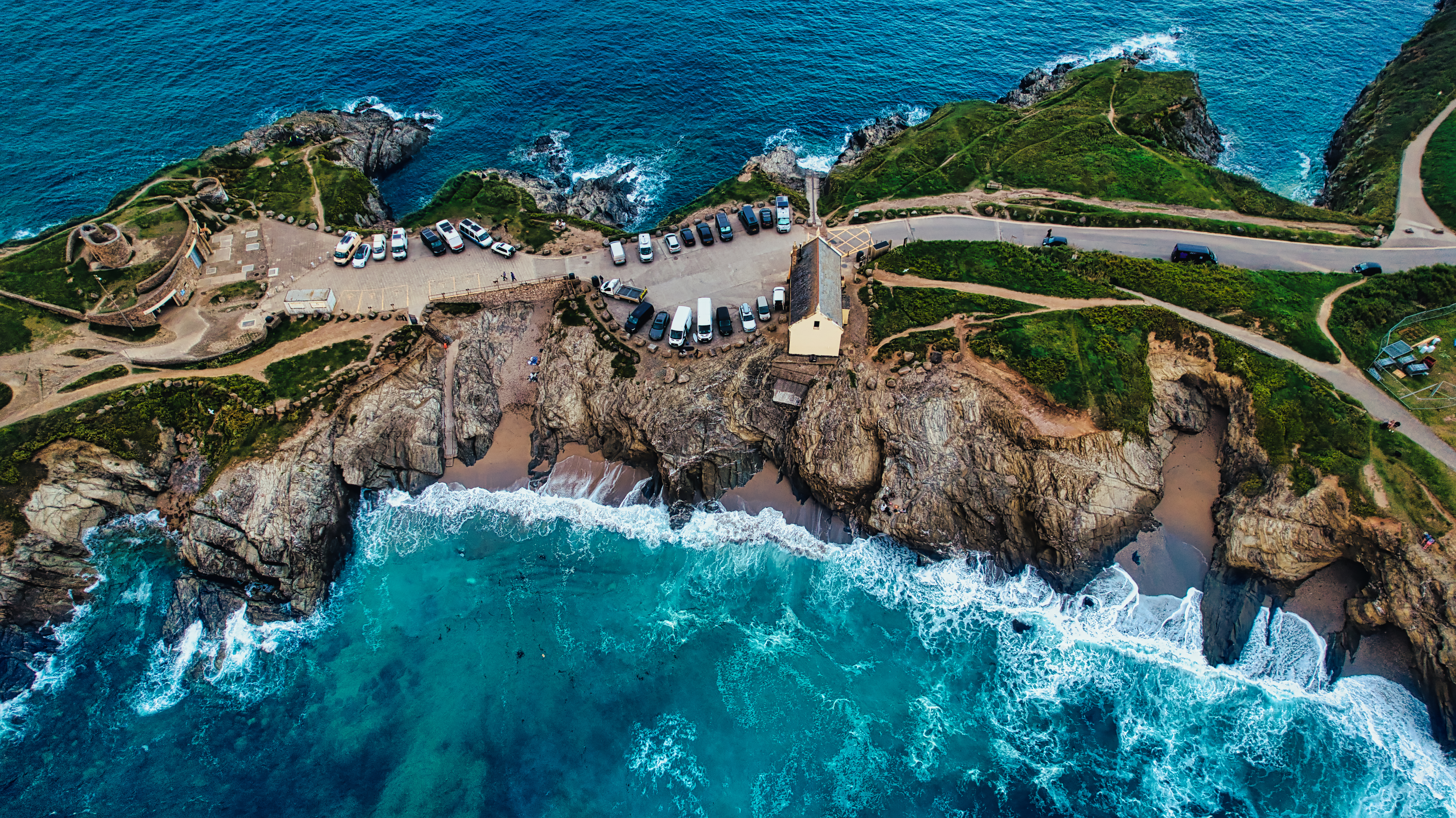 Aerial view of a coastal area featuring rocky cliffs, a beach, and a parking lot filled with cars. The turquoise waves crash against the rocks, creating a scenic landscape. Lush green hills surround the area, with a winding road leading to the beach.