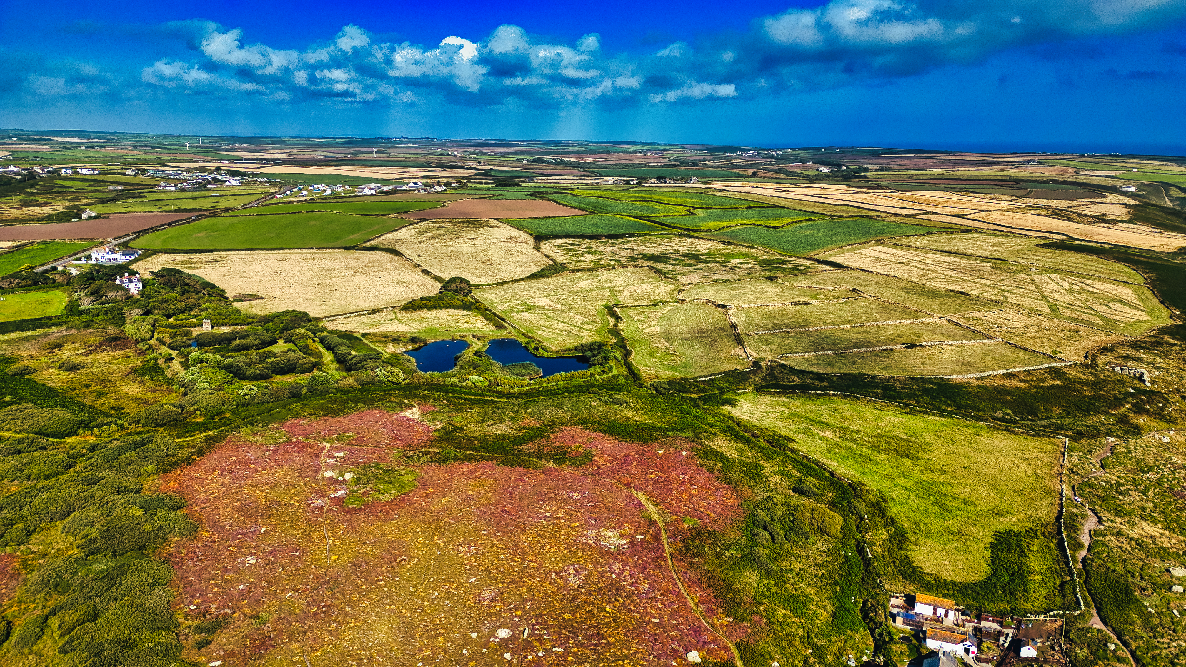 Aerial view of lush green fields and farmland under a bright blue sky with scattered clouds. The landscape features patches of different crops, a small pond, and a mix of agricultural land and natural vegetation.