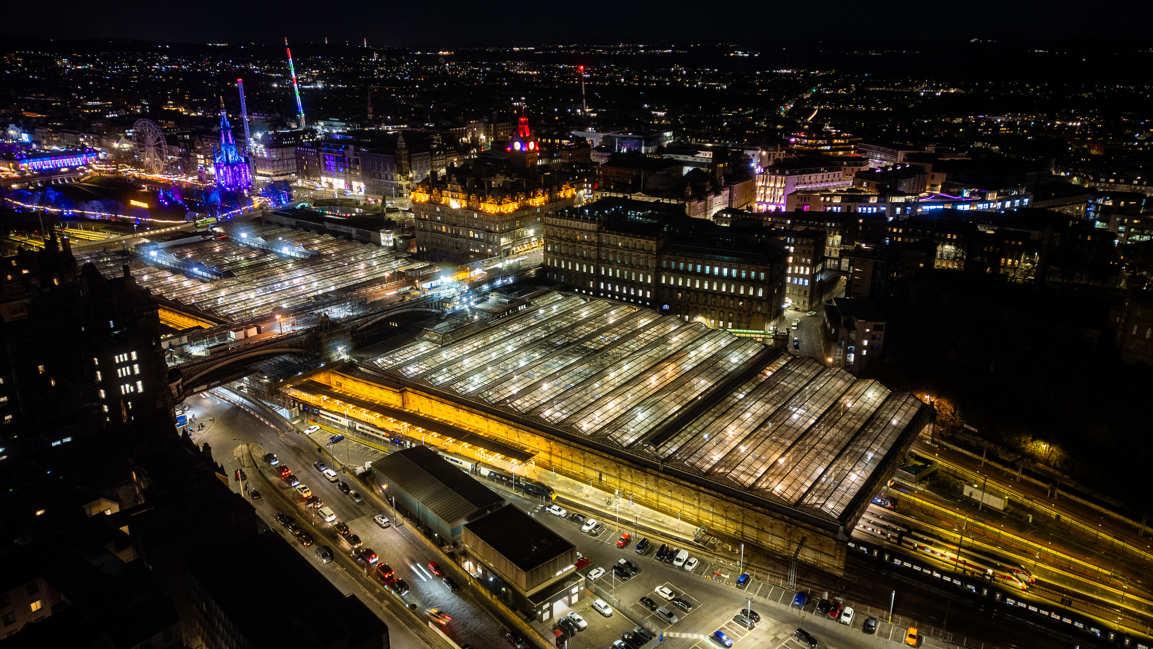 An aerial night view showcases a brightly lit train station and illuminated city buildings, with a distant Ferris wheel and colorful lights in Edinburgh, Scotland.