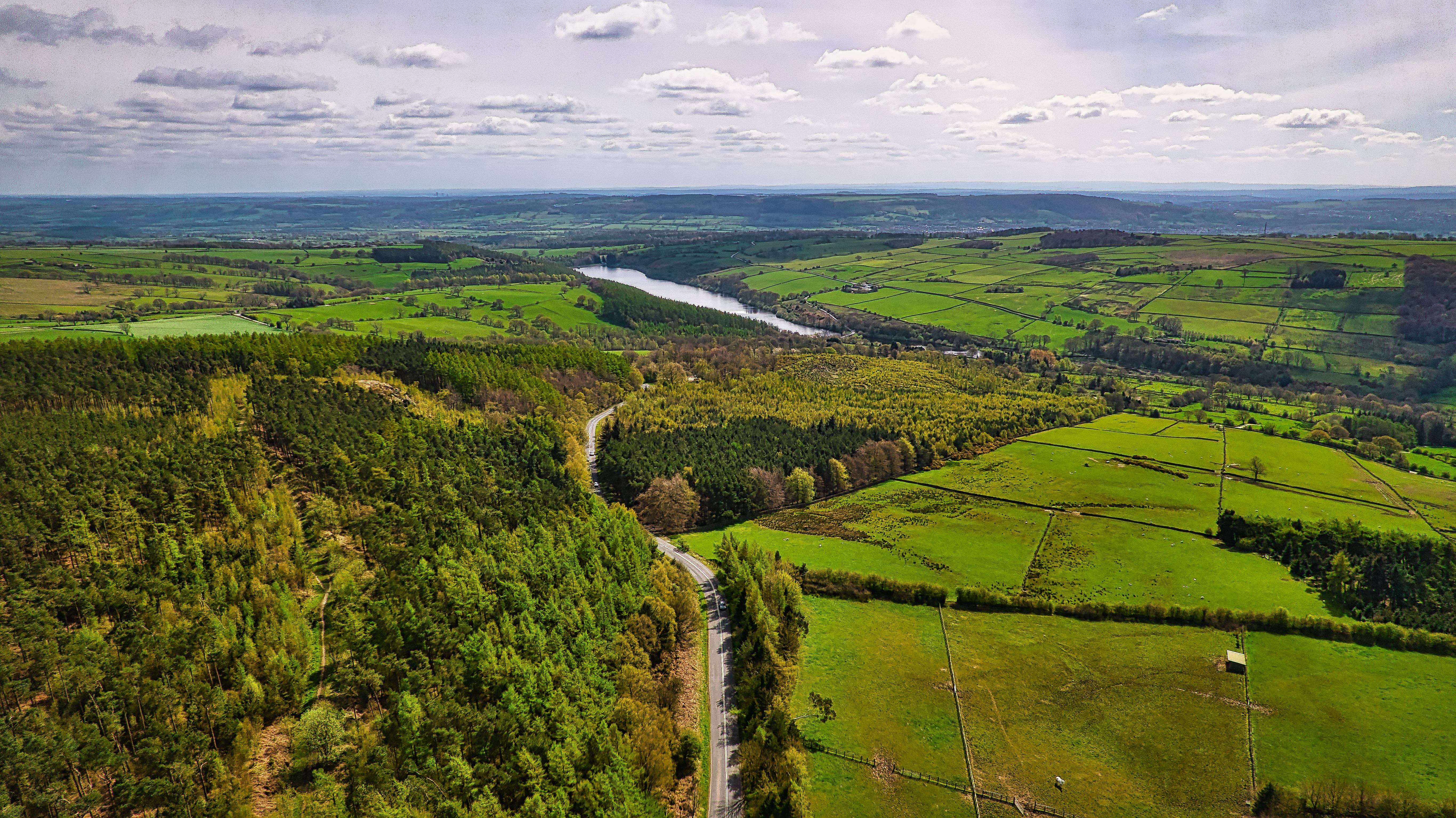 Aerial view of a lush landscape featuring a winding river, green fields, and dense forests under a partly cloudy sky.