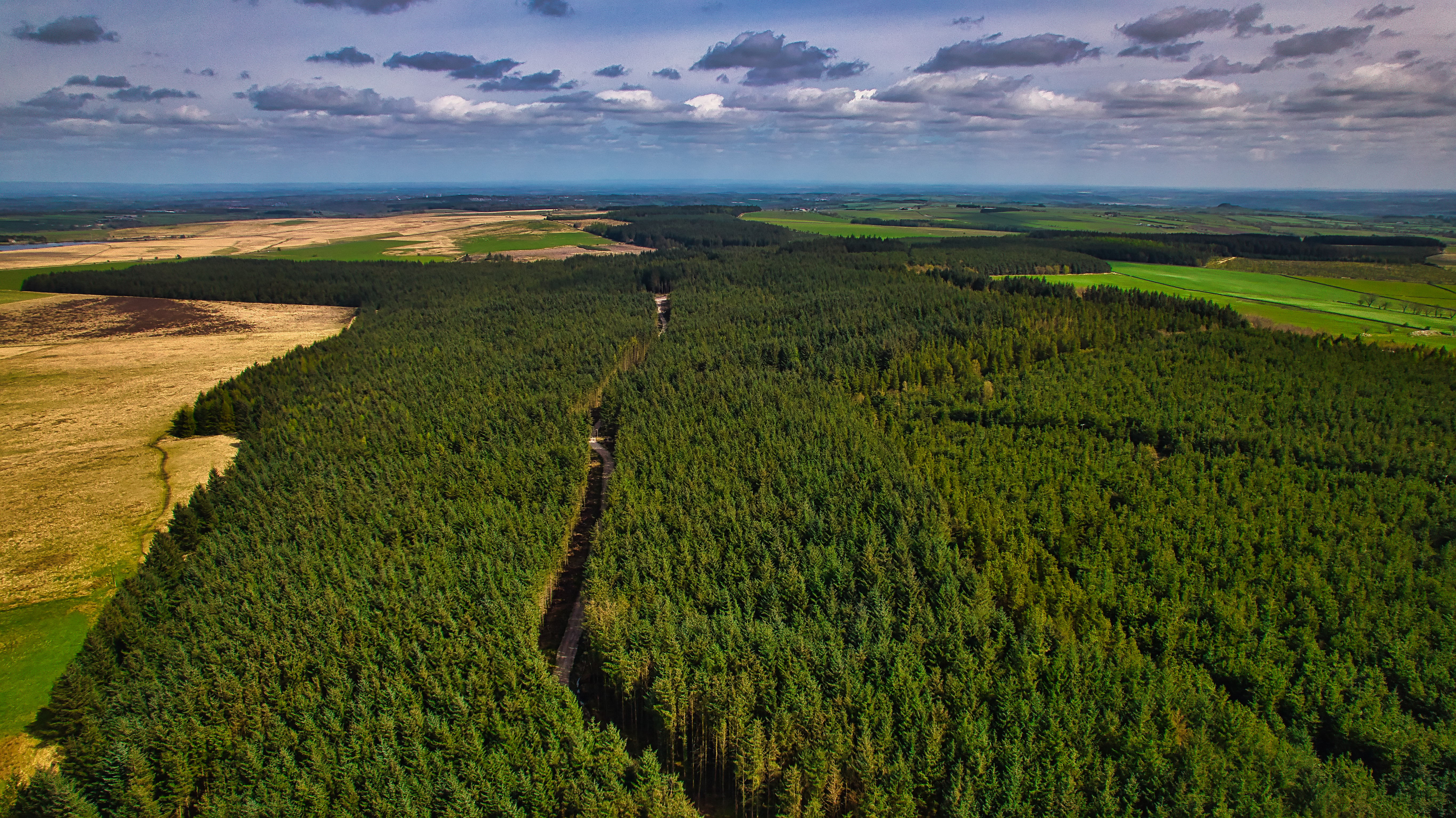 Aerial view of a dense forest with a clear path cutting through, surrounded by fields and distant forests under a cloudy sky.