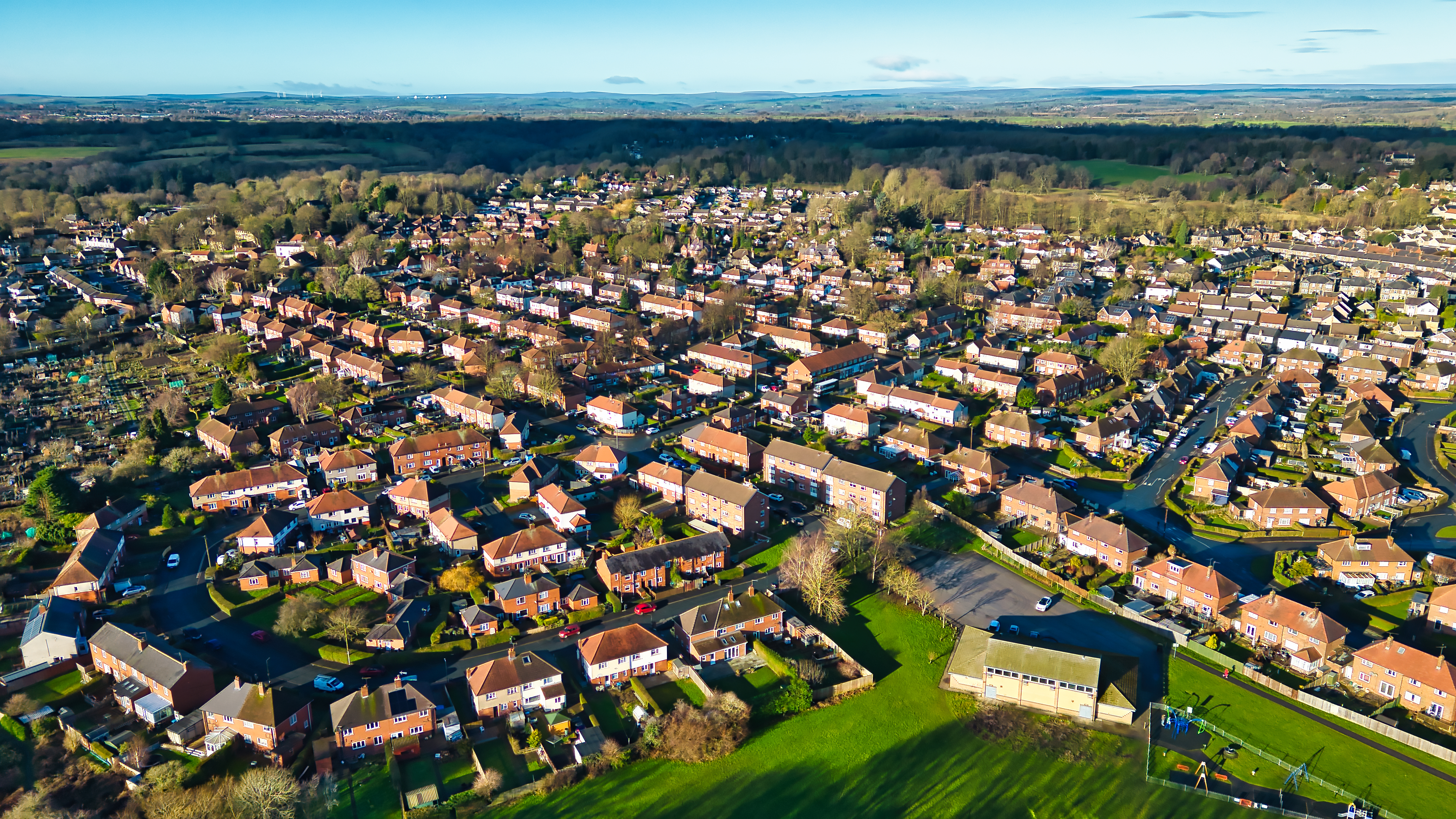 Aerial view of a residential area with numerous brick houses, tree-lined streets, and a small park with a building. The surrounding landscape includes fields and woodland in Knaresborough, UK.