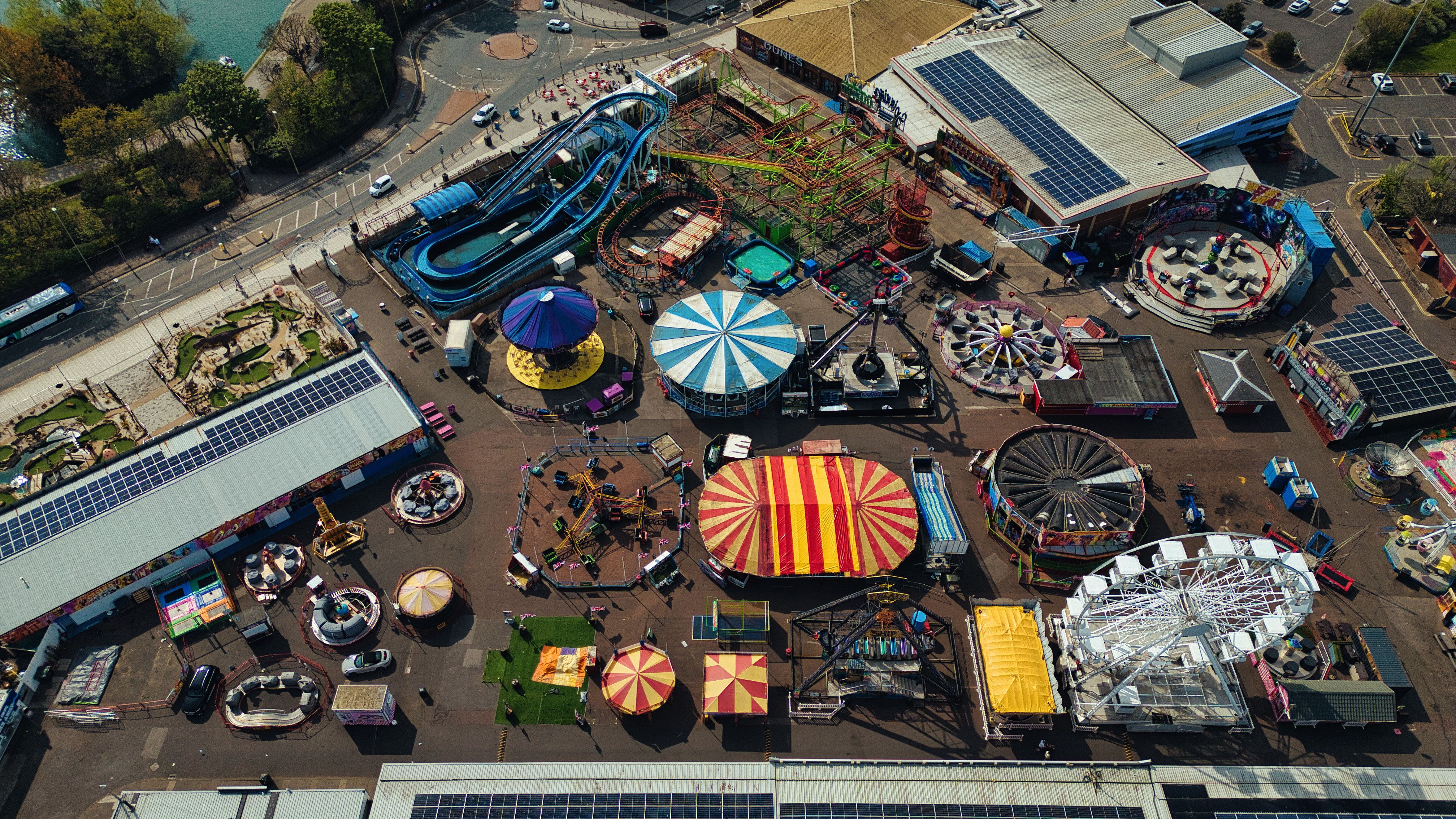 Aerial view of a colorful amusement park with various rides, buildings, and a nearby road and lake at Sandhaven Beach, UK.