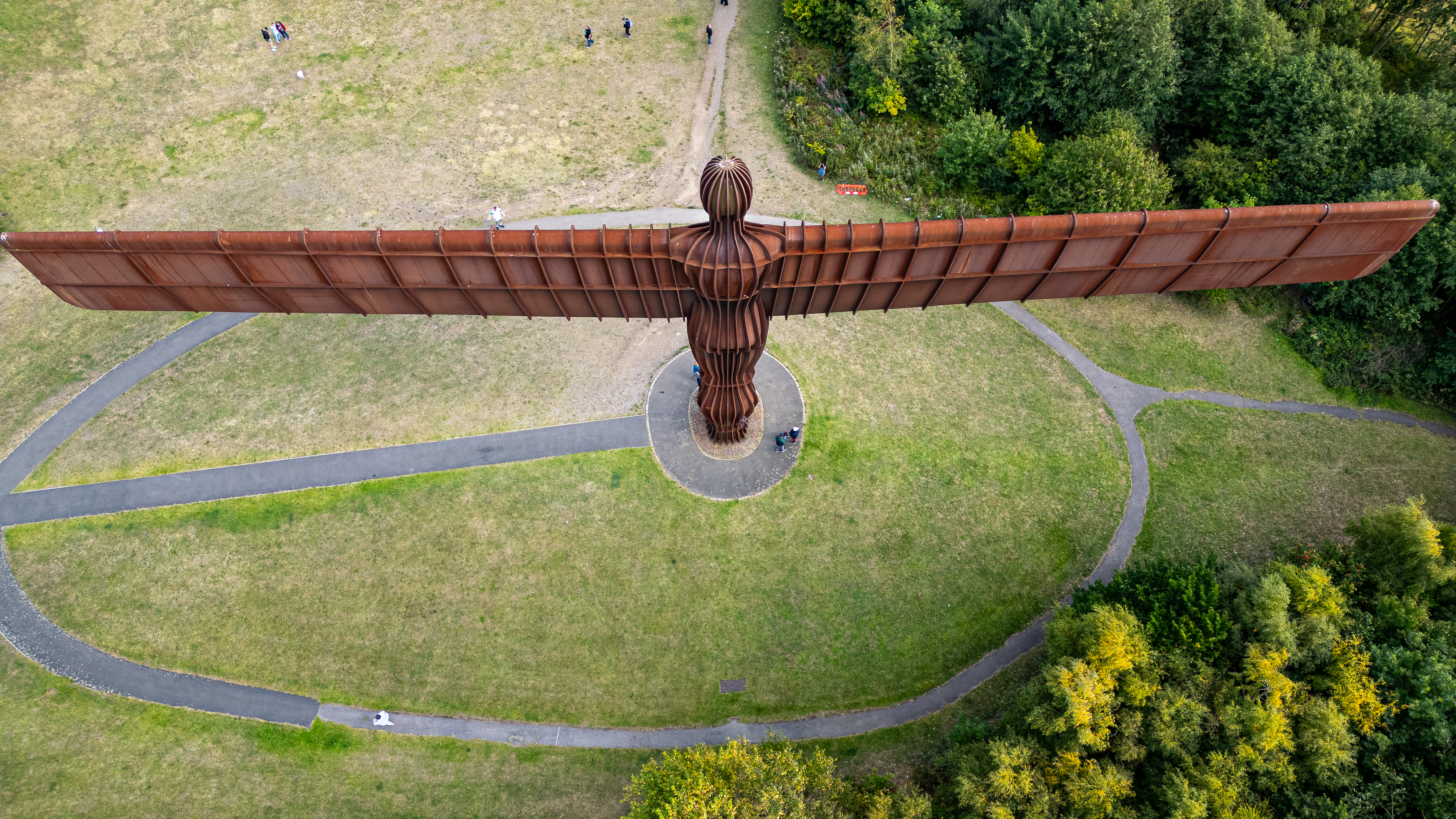 Aerial view of the rusty metal Angel of the North sculpture, spread across a green grassy landscape with winding paths and surrounding trees in Newcastle upon Tyne, UK.