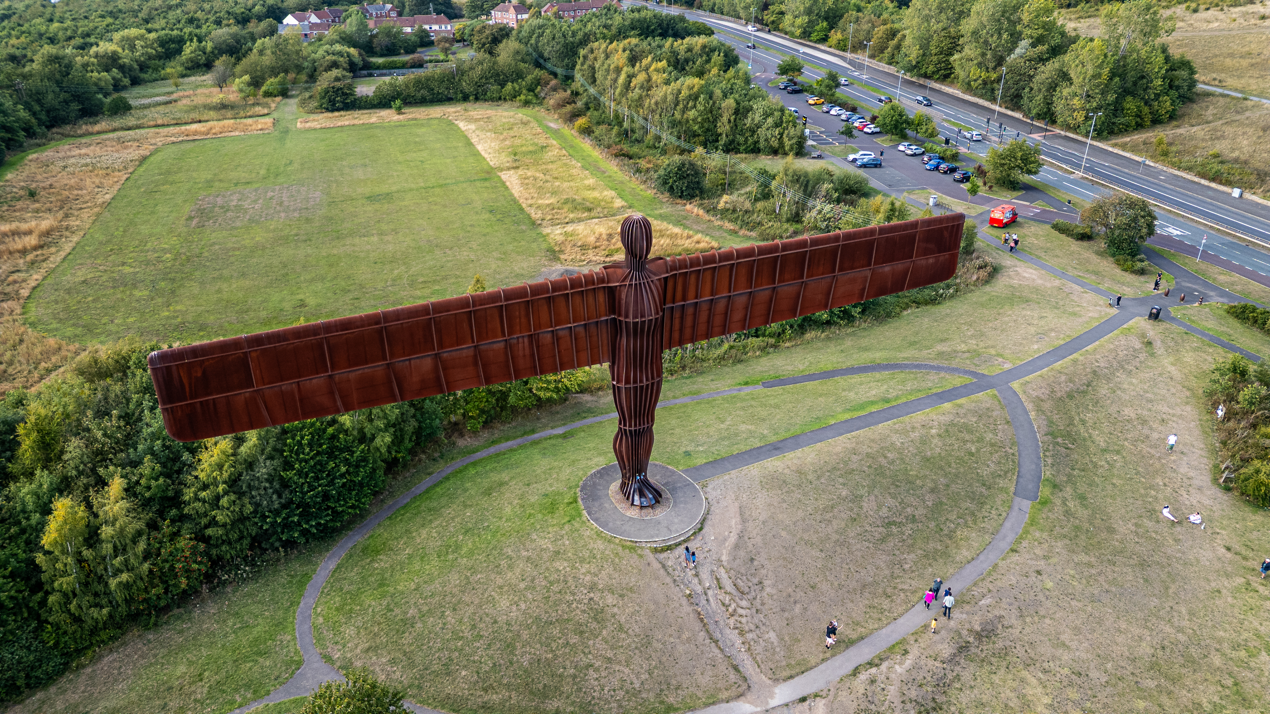 An aerial view of the Angel of the North sculpture, made of weathered steel, stands prominently on a grassy hill with pathways leading to it, a road with cars, and distant houses in Newcastle upon Tyne, UK.