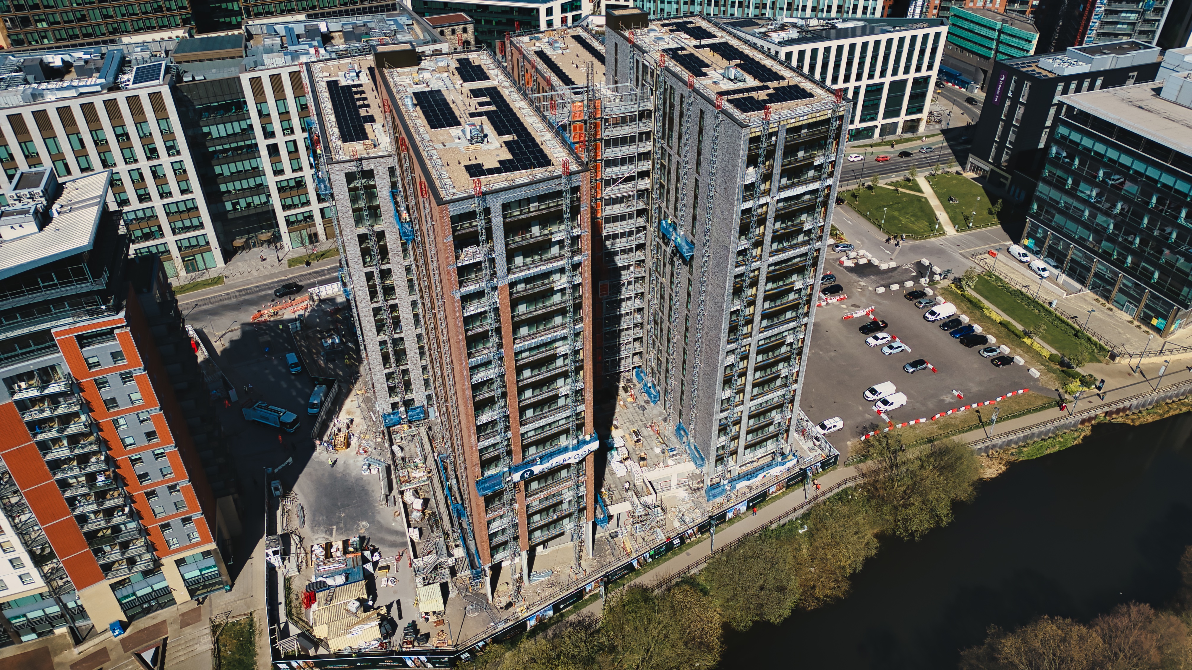 Aerial view of modern apartment buildings under construction with solar panels, surrounded by cityscape, parking, and river in Leeds, UK.