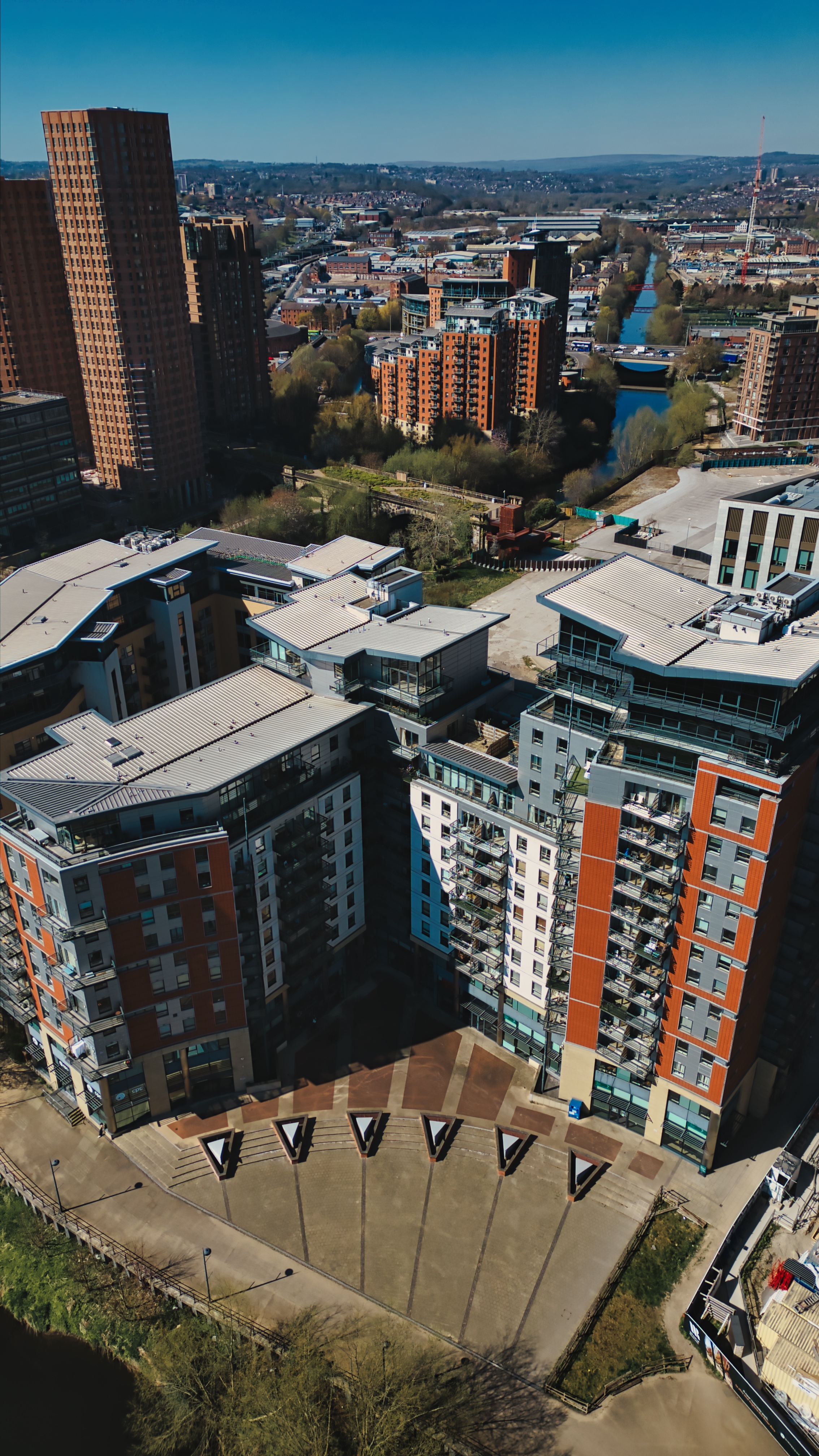 Aerial view of modern apartment buildings and urban landscape under a clear blue sky on a sunny day, featuring a canal and cityscape in Leeds, UK.