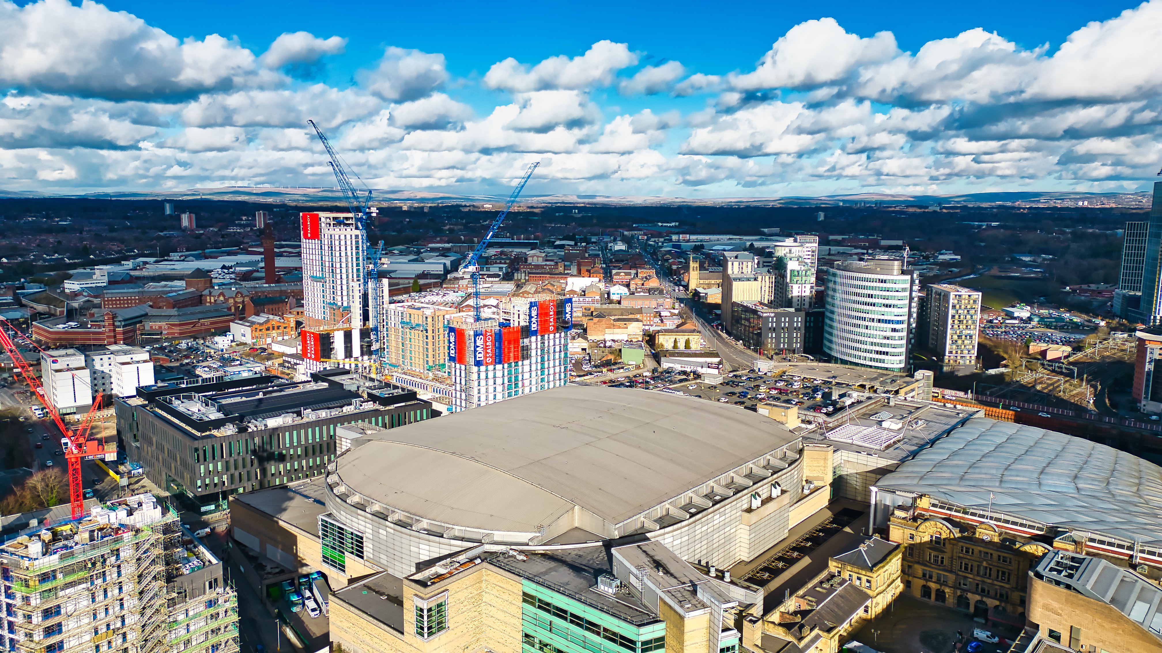Aerial view of a city landscape featuring a large arena, high-rise buildings under construction, and surrounding urban development under a partly cloudy sky in Manchester, UK.