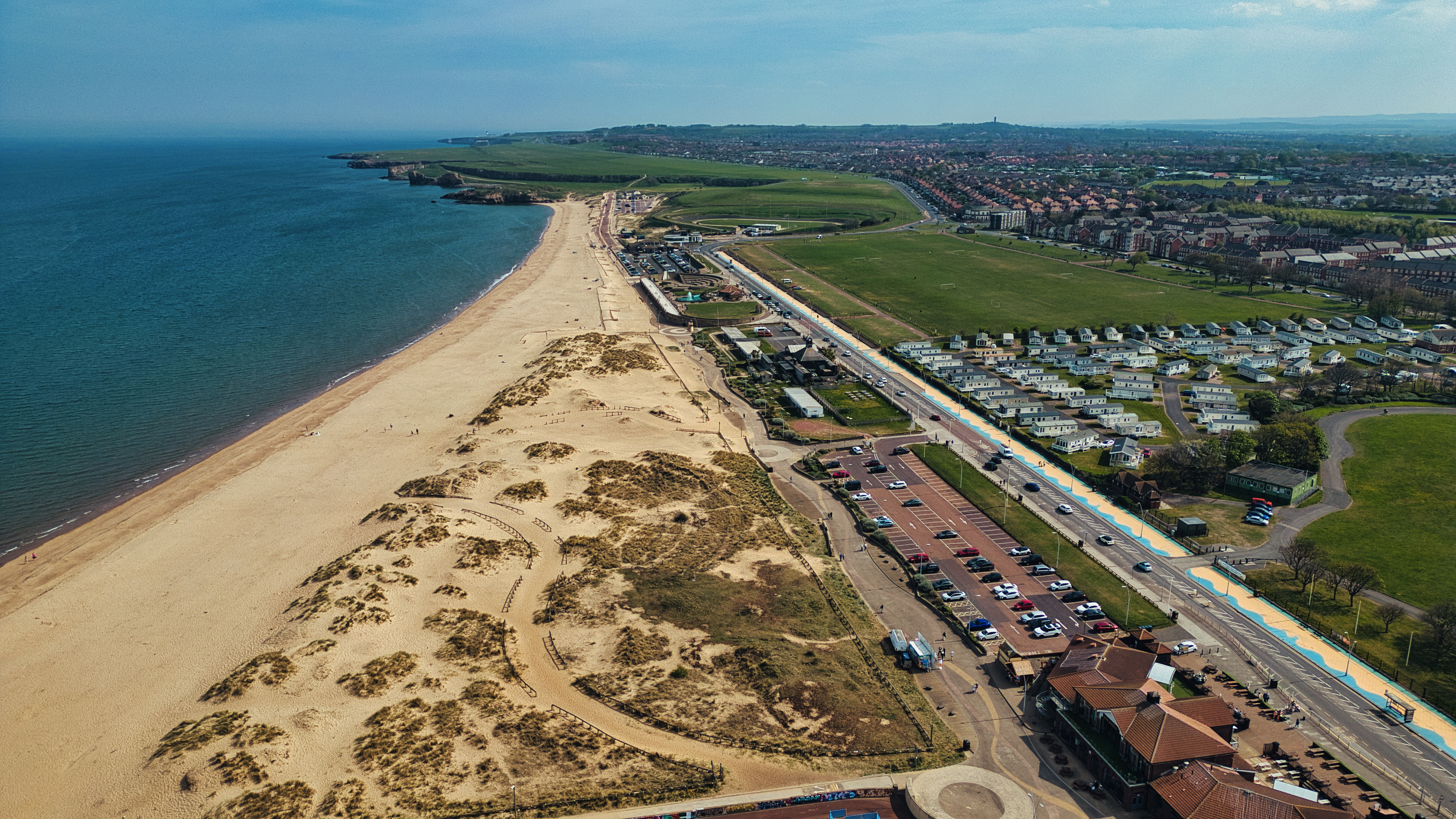 Aerial view of a coastline with a sandy beach, dunes, road, buildings, parking lots and a town under a blue sky with some clouds at Sandhaven Beach, UK.