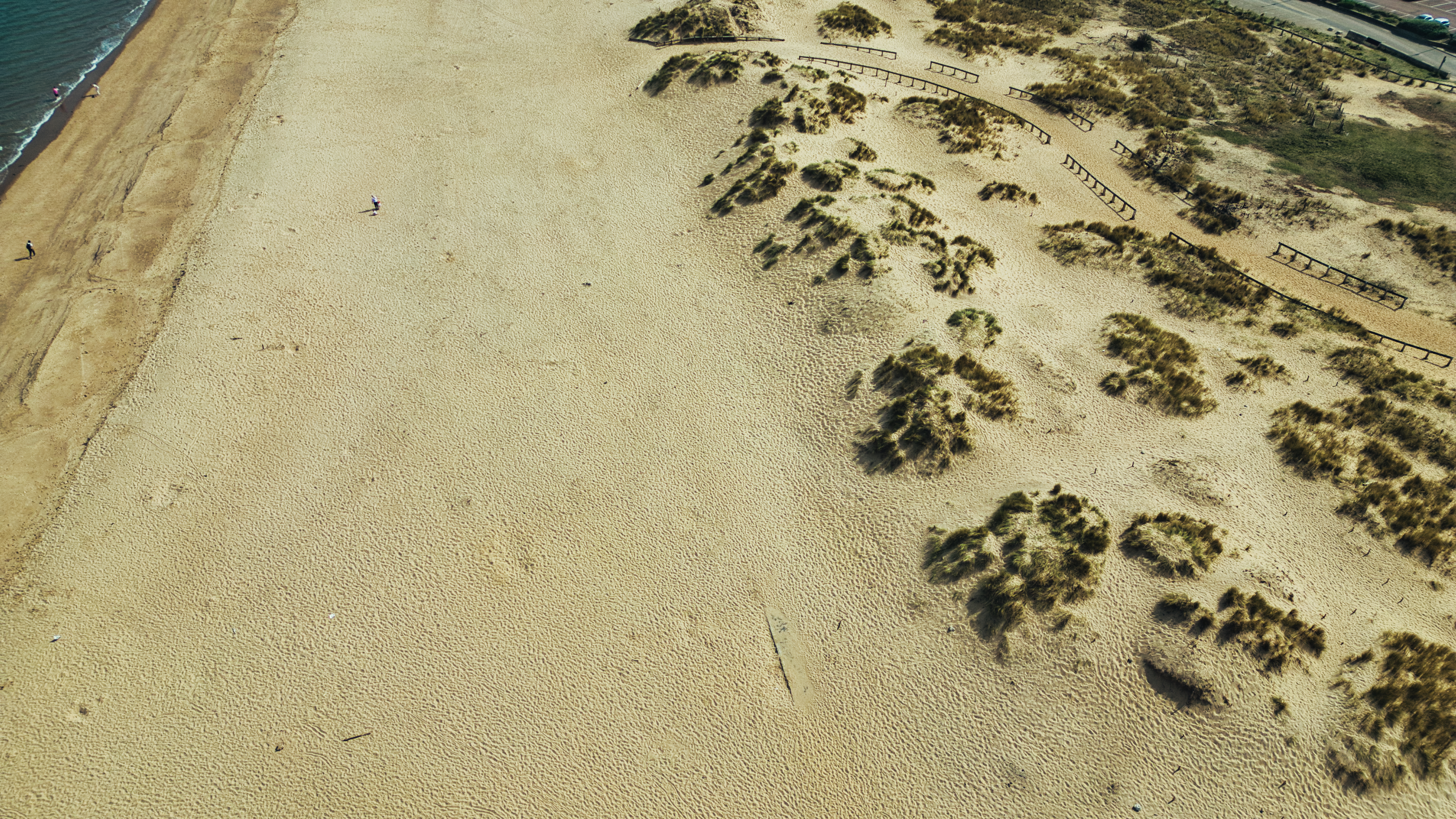 Aerial view of a beach with sand dunes, sparse vegetation, and a walkway. People are walking on the shoreline at Sandhaven Beach, UK.