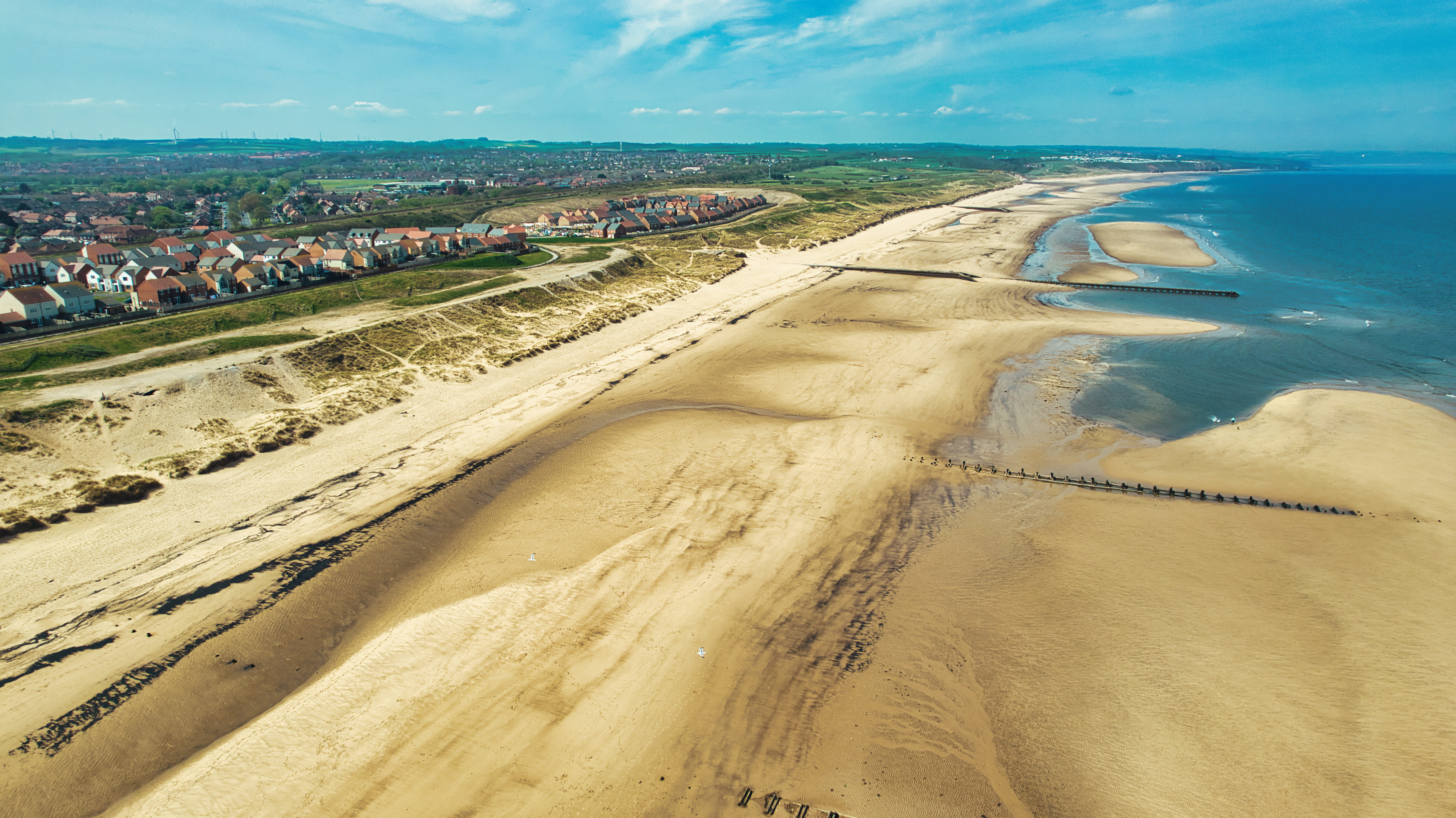 Aerial view of a wide sandy beach meeting the ocean, with houses and greenery in the background under a blue sky with scattered clouds at Steetley Pier, UK.