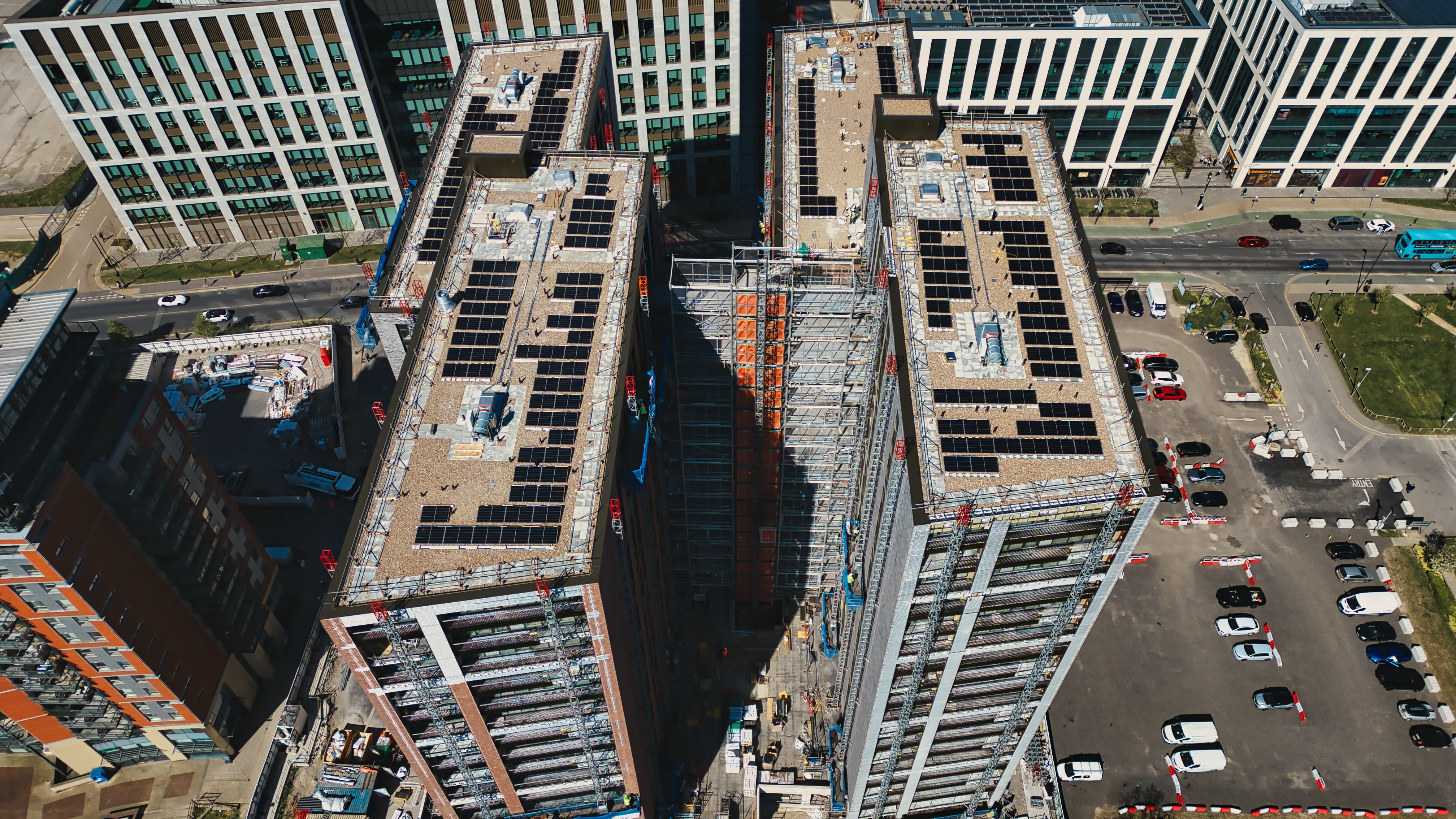 Aerial view of multiple buildings including buildings with solar panels, scaffolding, and construction equipment, cars and roads in Leeds, UK.