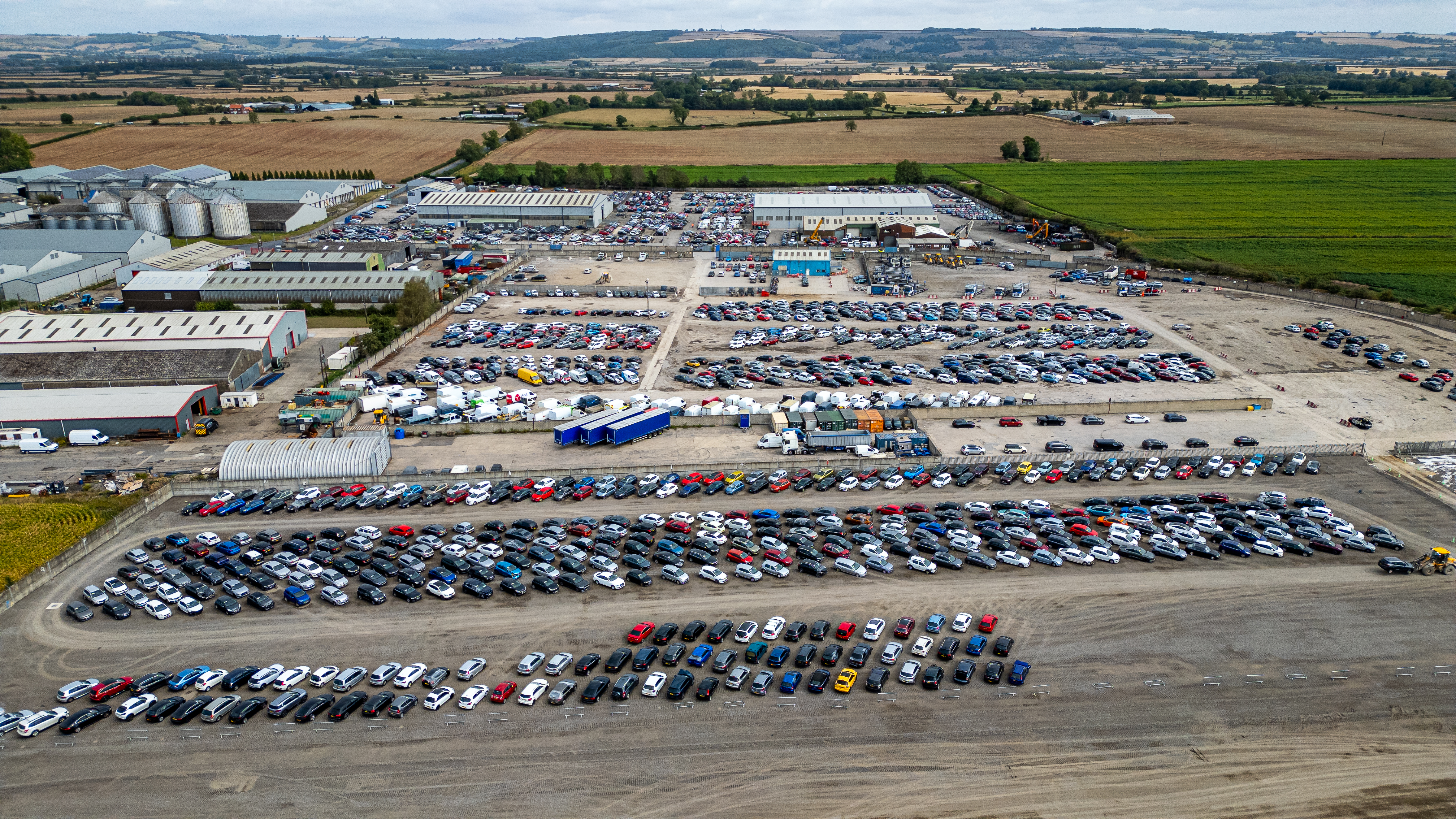 An aerial view of a vast car storage facility with rows of vehicles parked on gravel lots, surrounded by industrial buildings and agricultural fields under a cloudy sky at Copart yard in York, UK.