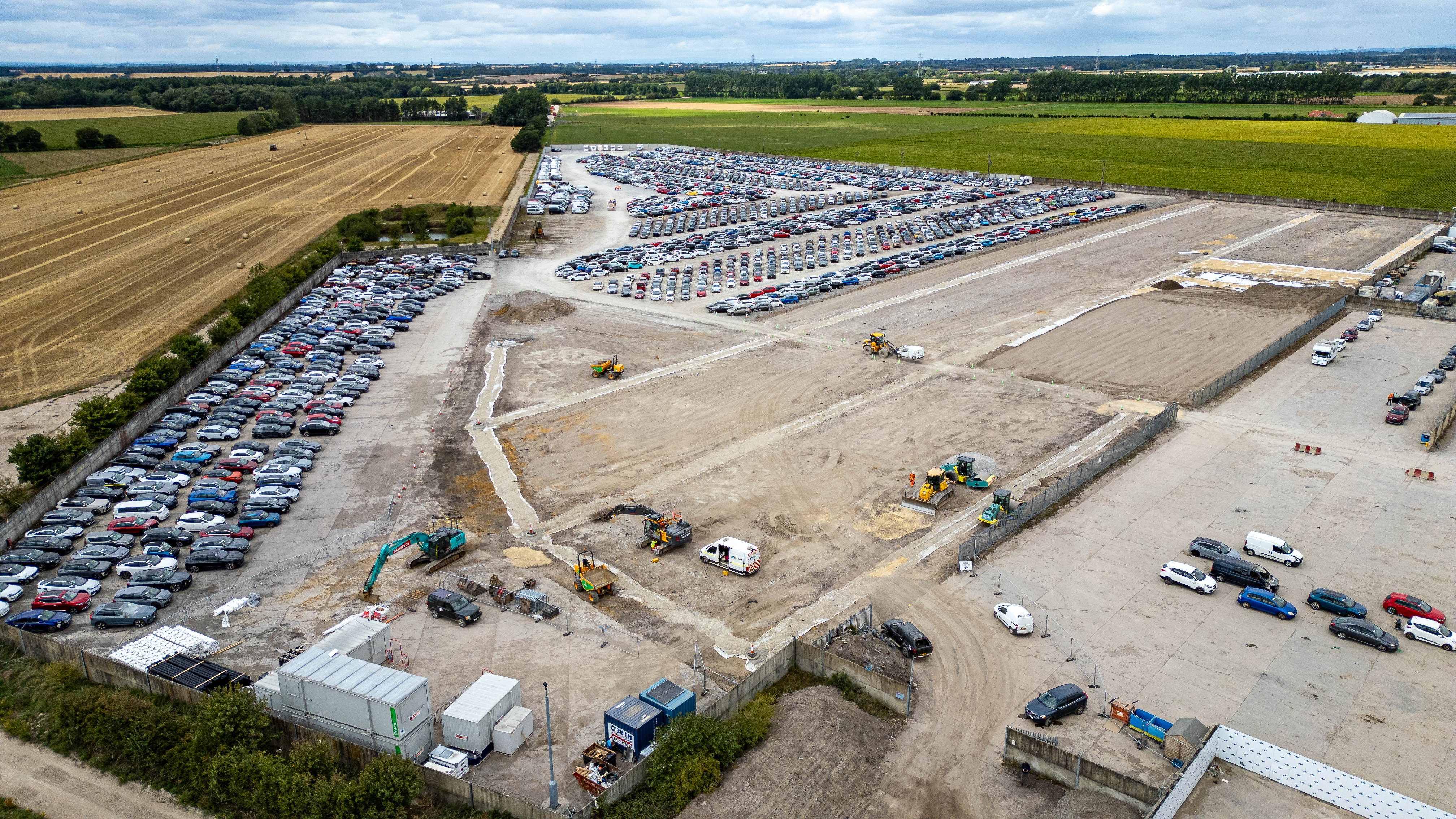 An aerial view of a large outdoor car storage lot with rows of vehicles, construction equipment, and surrounding agricultural fields at Copart yard in York, UK.