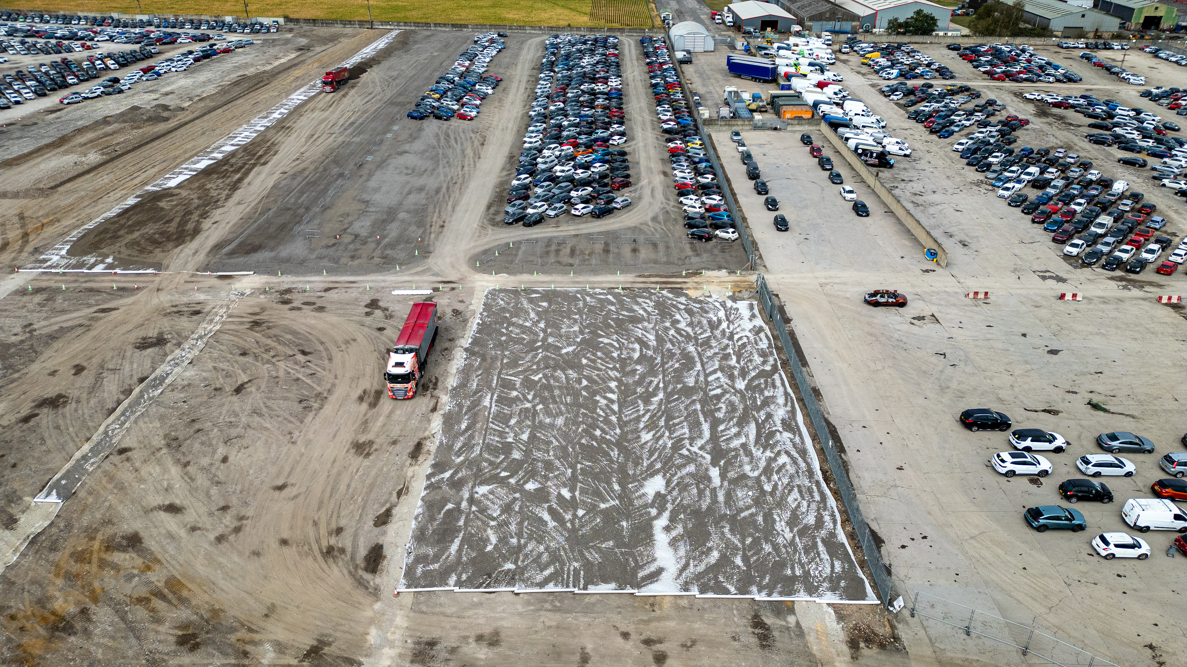 An aerial view of a large car storage lot with rows of parked vehicles, a red truck, and a section of graded dirt with tire tracks at Copart yard in York, UK.