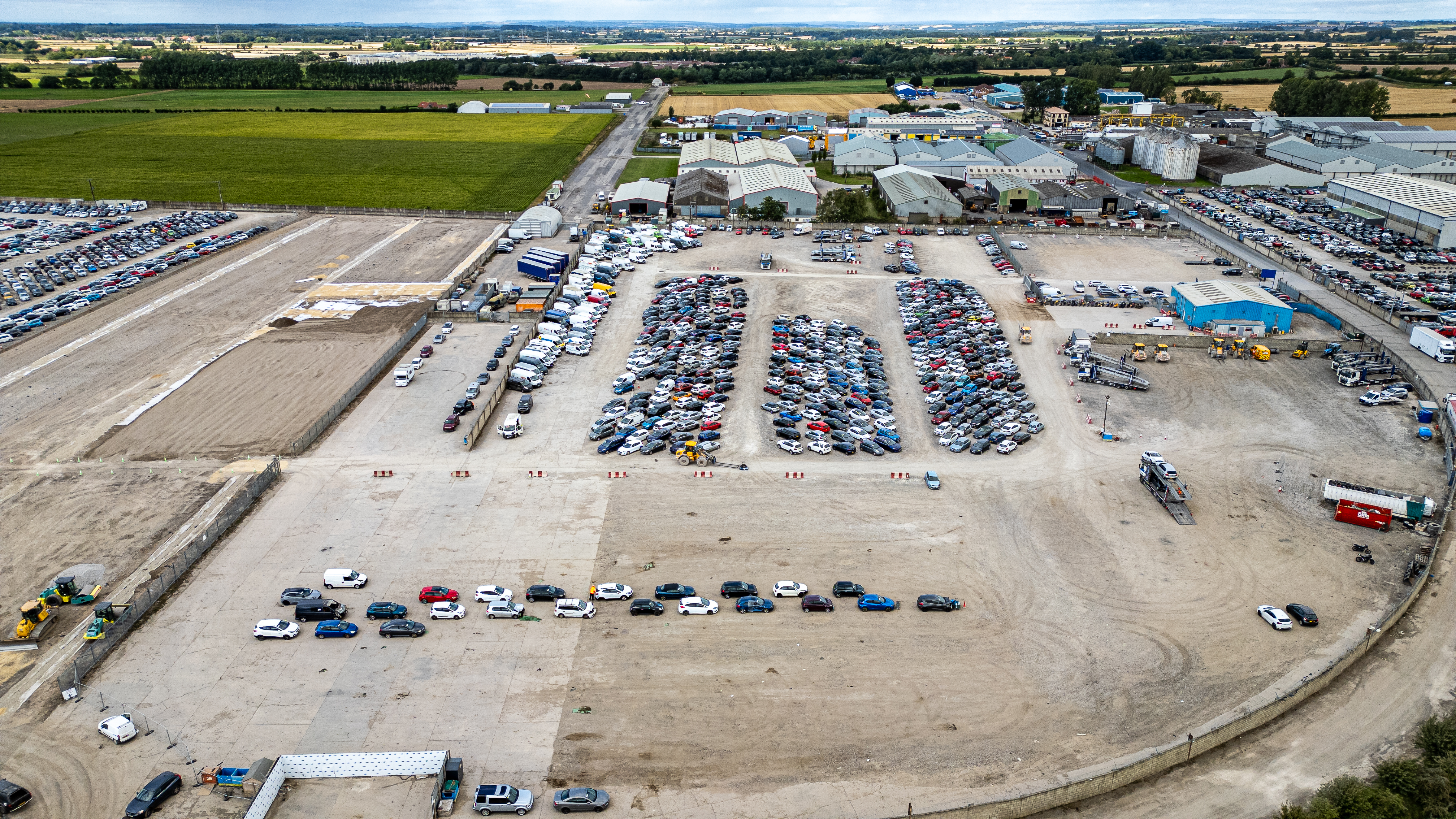 Aerial view of a vast car storage lot filled with many vehicles, industrial buildings, agricultural fields, and a partly cloudy sky at Copart yard in York, UK.