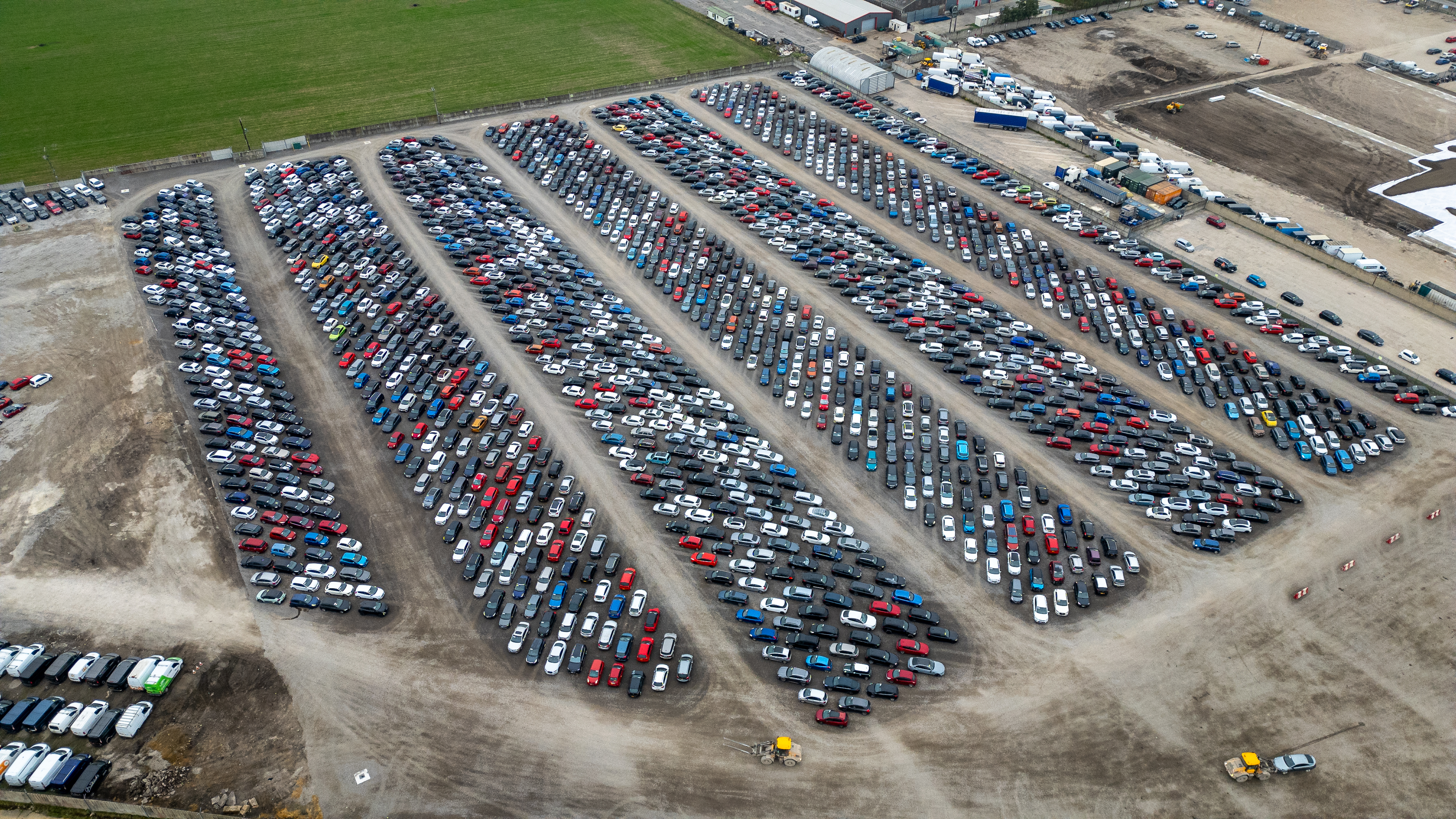 An aerial view of a vast car storage lot, filled with rows and rows of vehicles. Different colors and types of cars are visible, along with some trucks and equipment at Copart yard, York, UK.