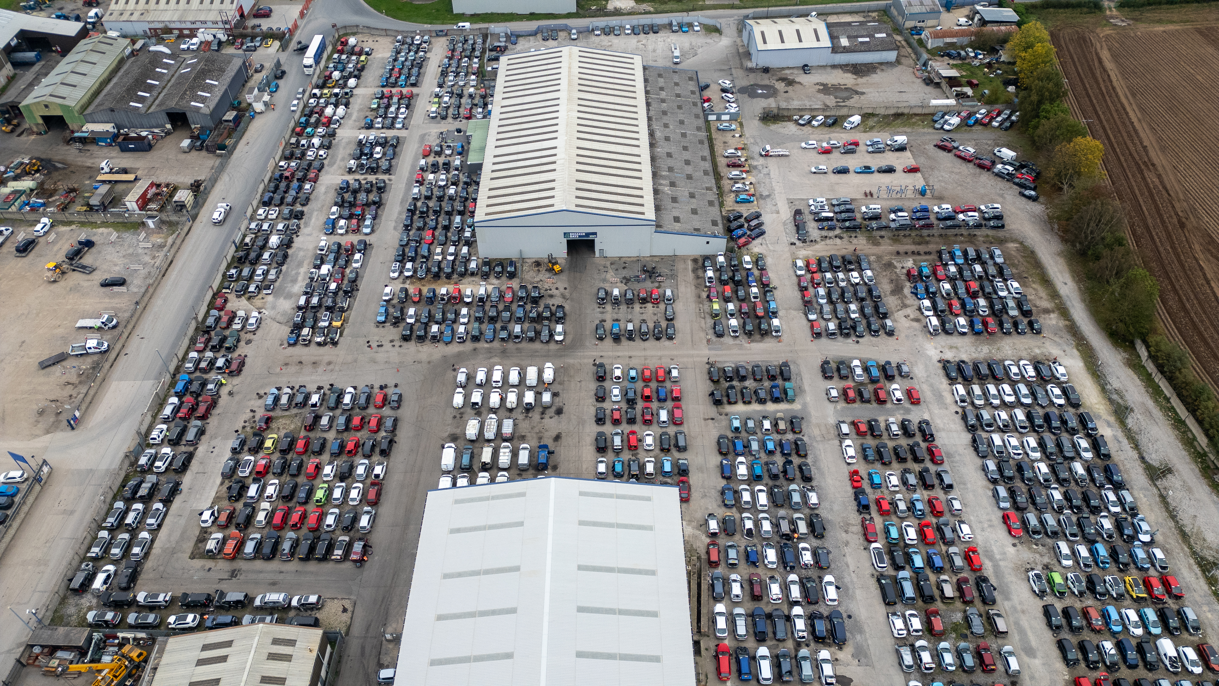 An aerial view showcases a vast industrial yard filled with neatly parked cars, adjacent to warehouses and agricultural fields at U-Pull-It York, UK.
