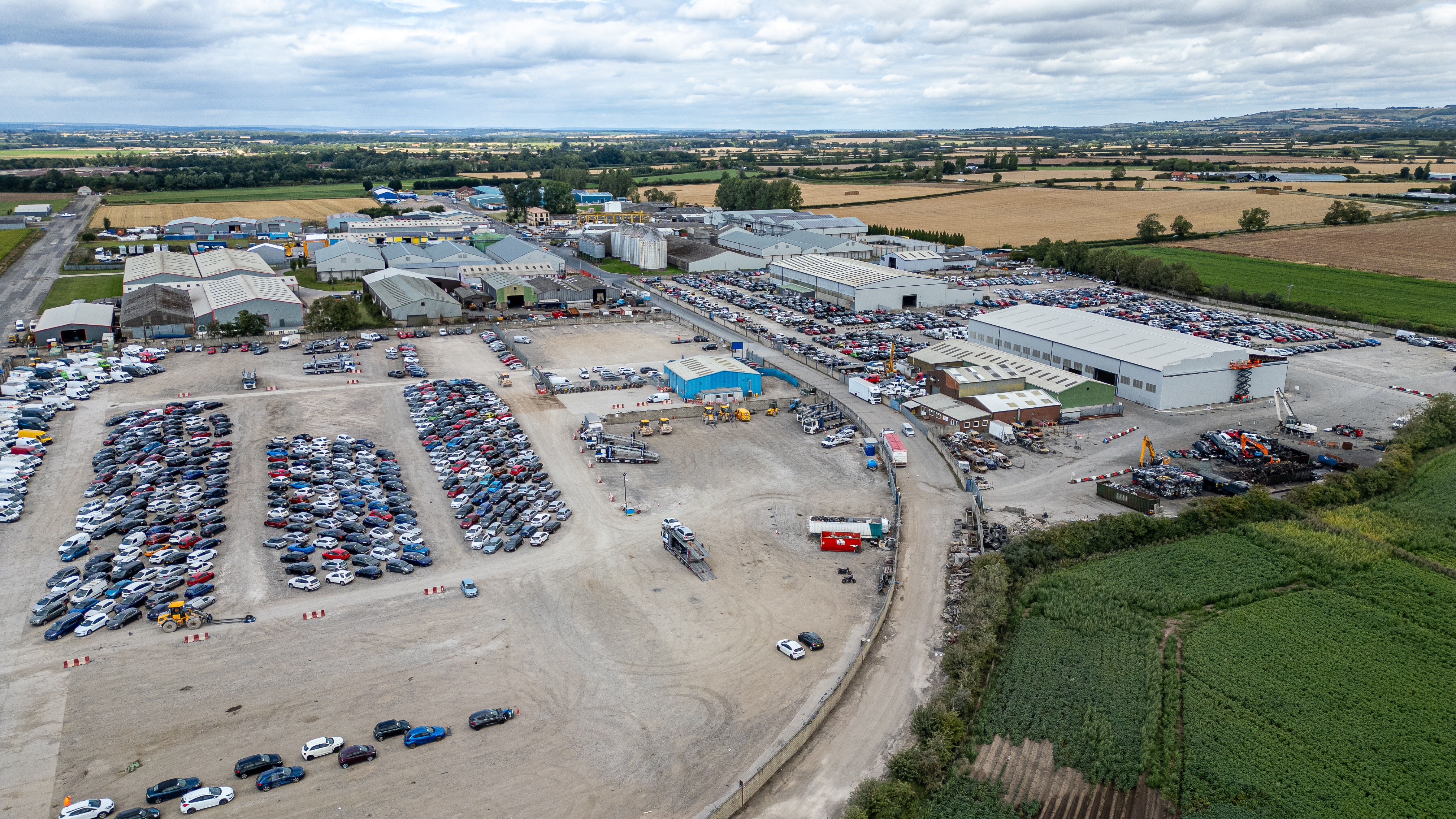 Aerial view of a car storage and processing facility, featuring large car parks, industrial buildings, and surrounding agricultural fields under a cloudy sky at Copart yard in York, UK.