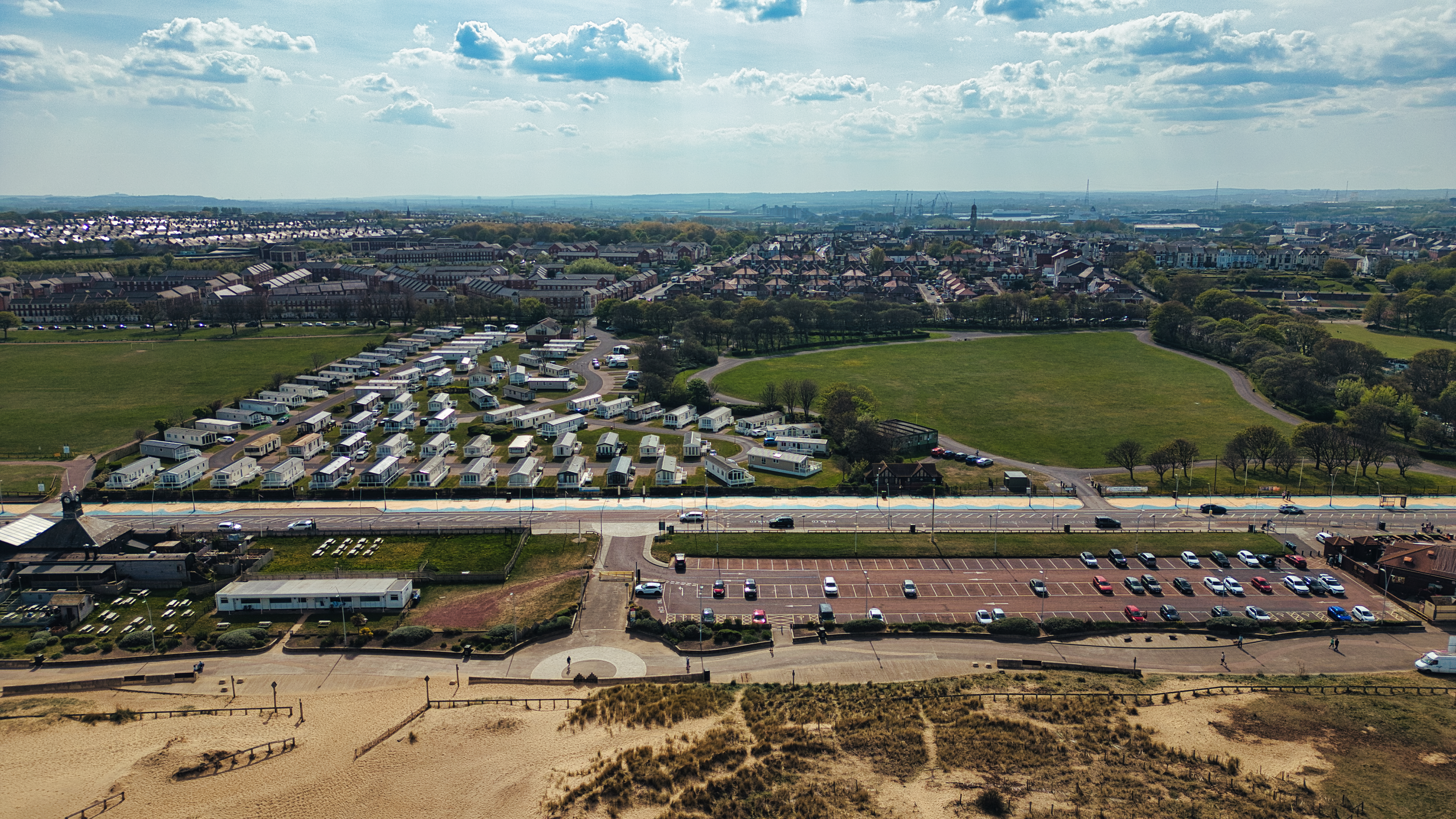 Aerial view showing a caravan park near a beach, road, and parking lot, with a town in the background and a cloudy sky at Sandhaven Beach, UK.
