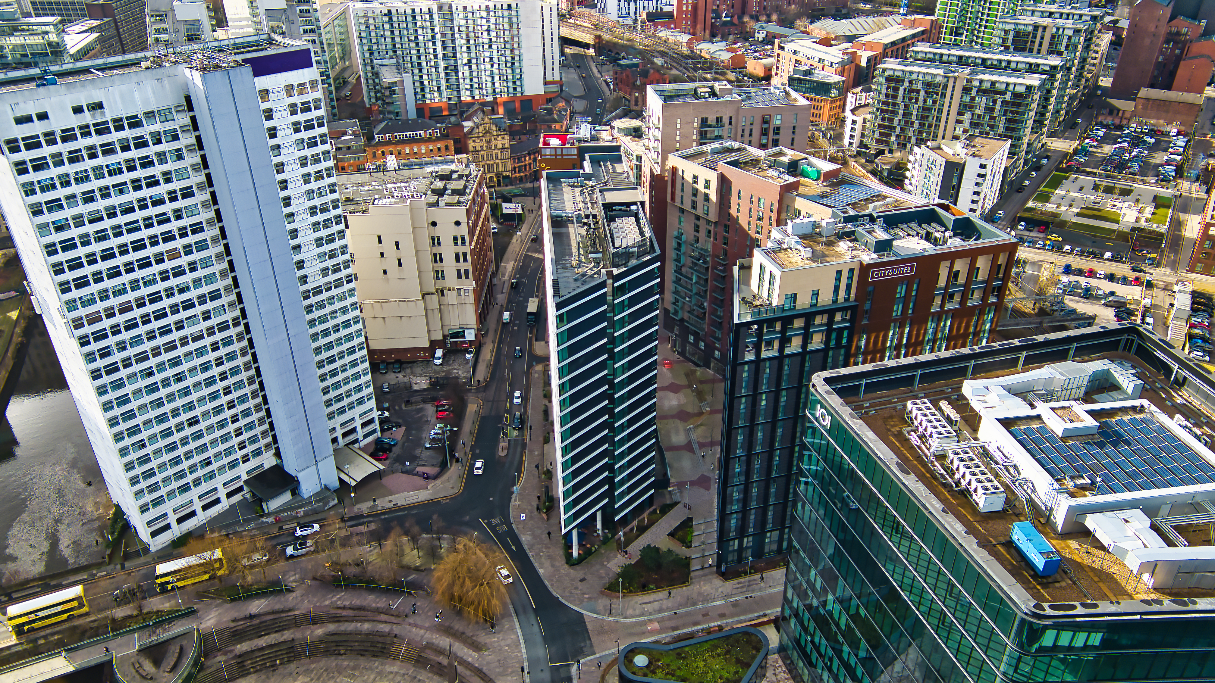 Aerial view of a city block featuring several high-rise buildings of varying architectural styles and colors, including a prominent white high-rise, dark-glass modern buildings, and brick structures. Street level features cars, buses, and pedestrian areas in Manchester, UK.