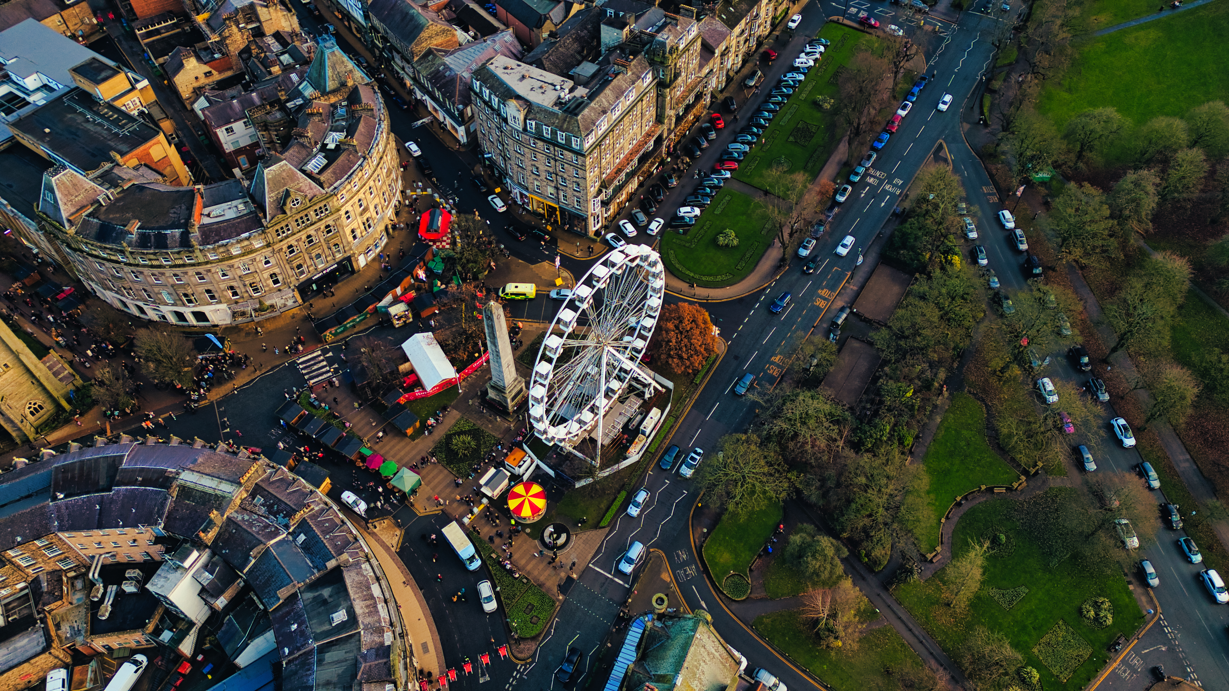 Aerial view of a city square featuring a Ferris wheel, surrounding buildings, parked cars, and a Christmas market. The scene is captured during the day, showing a mix of architectural styles and urban landscaping.