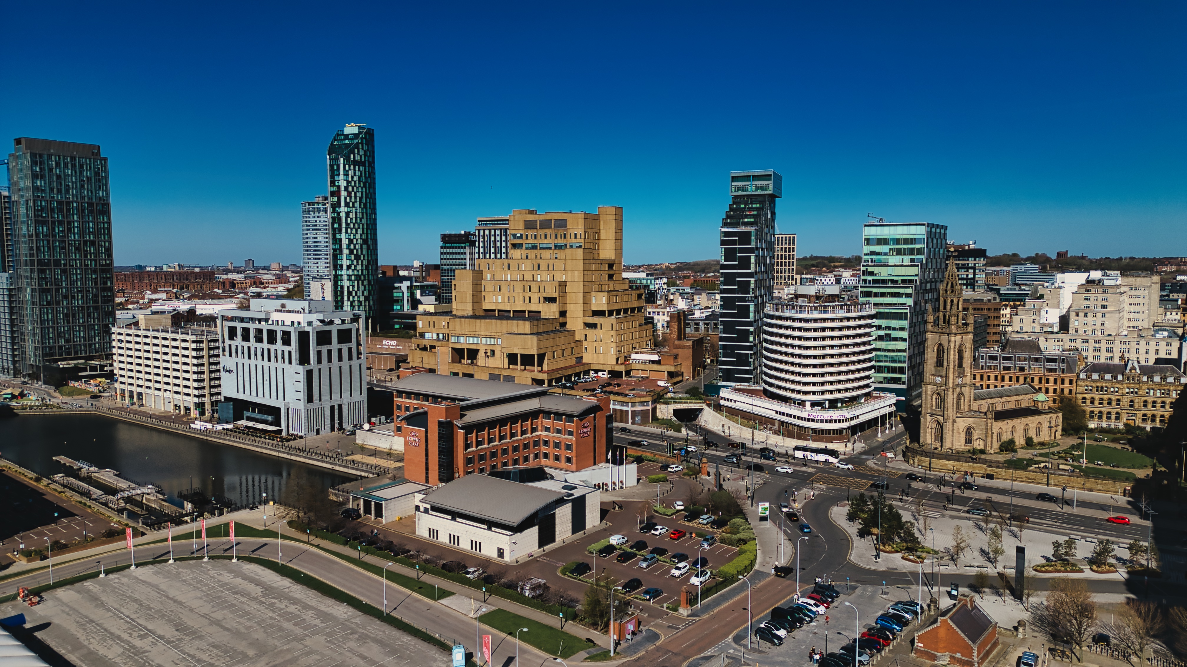 An aerial view of a city skyline under a clear blue sky features modern buildings and a historic church, with a canal and parking areas visible in Liverpool, UK.