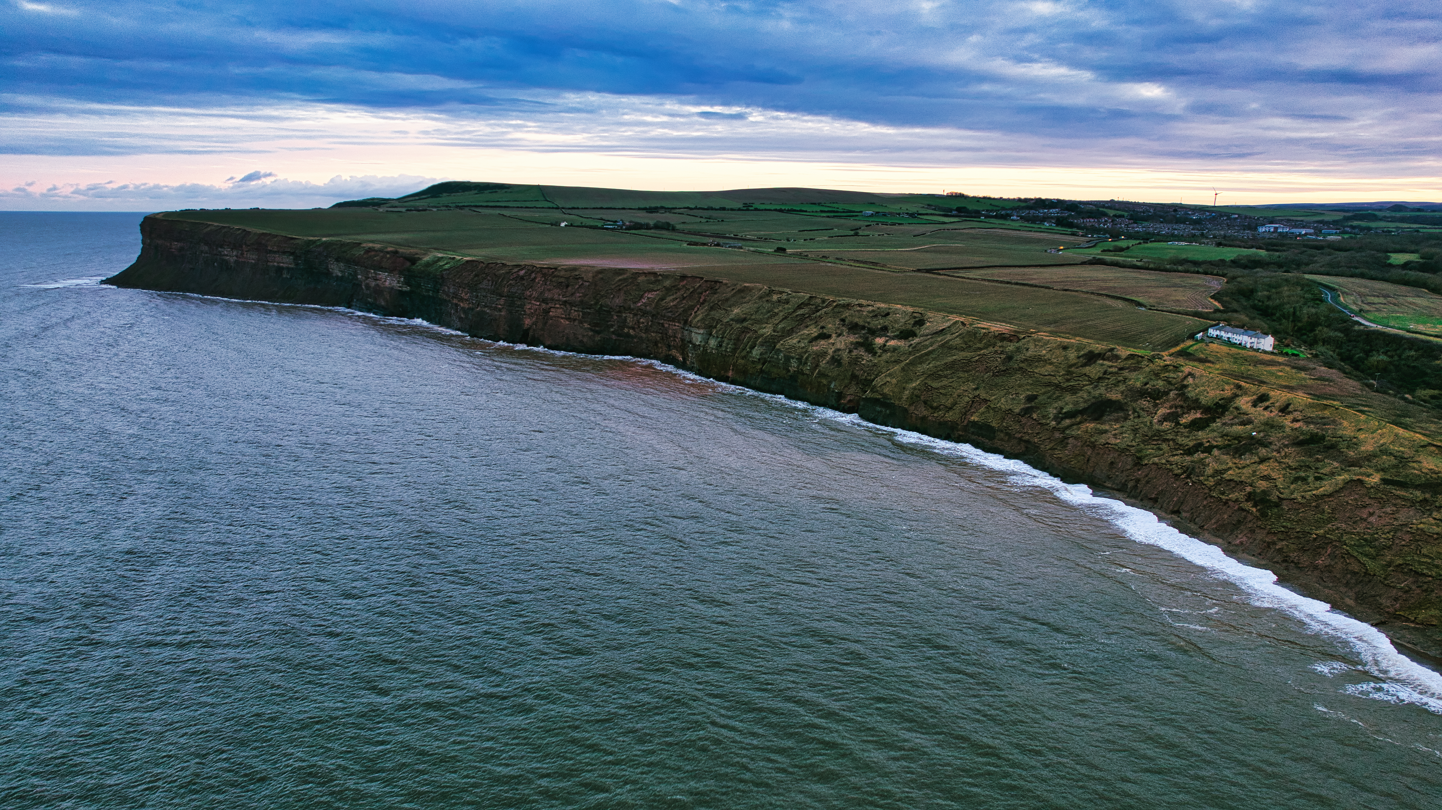 Aerial view of a coastal cliff face, exhibiting layered rock formations, adjacent to a calm sea under a partly cloudy sky. Farmland is visible atop the cliff. A small building is present near the cliff's edge in Saltburn by the Sea