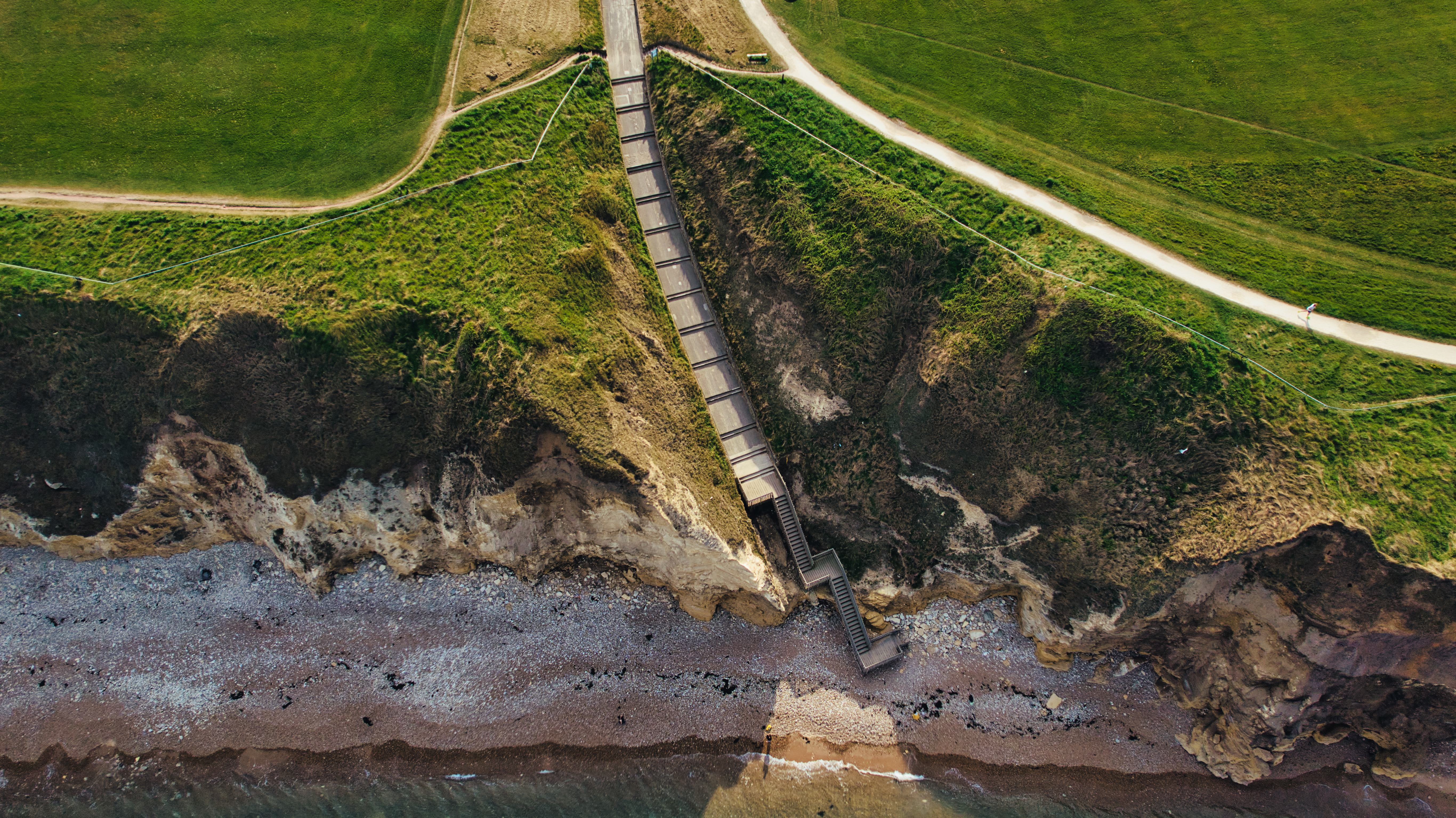 Aerial view of a cliffside with a path, stairs leading to a pebble beach, and a connecting trail along green grass and farmland at Marsden Beach, UK.