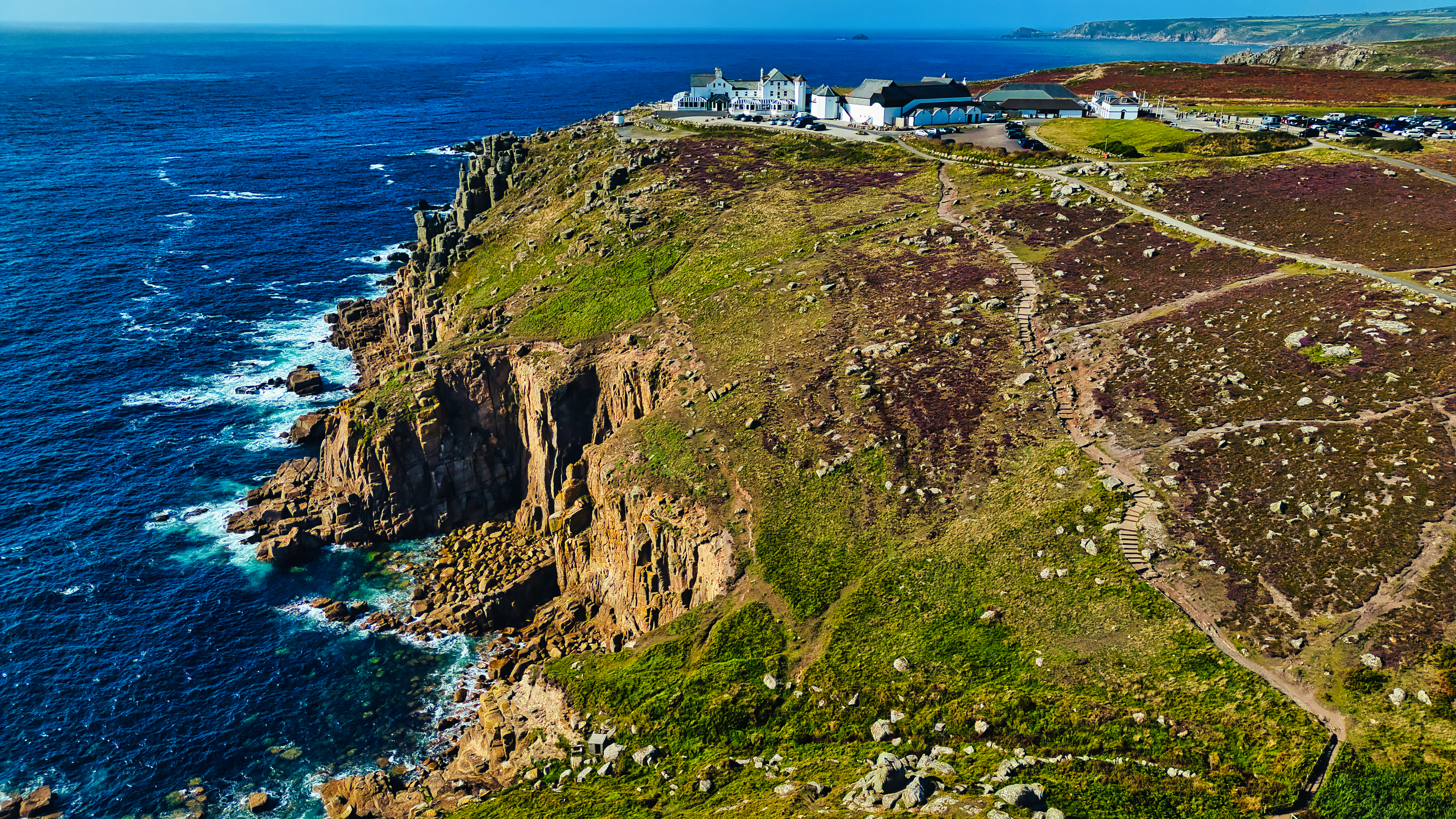 Aerial view of a rugged coastline with cliffs and a hotel on top. The landscape features green hills, rocky outcrops, and the deep blue ocean. The sky is clear, and the scene captures the natural beauty of the coastal area.