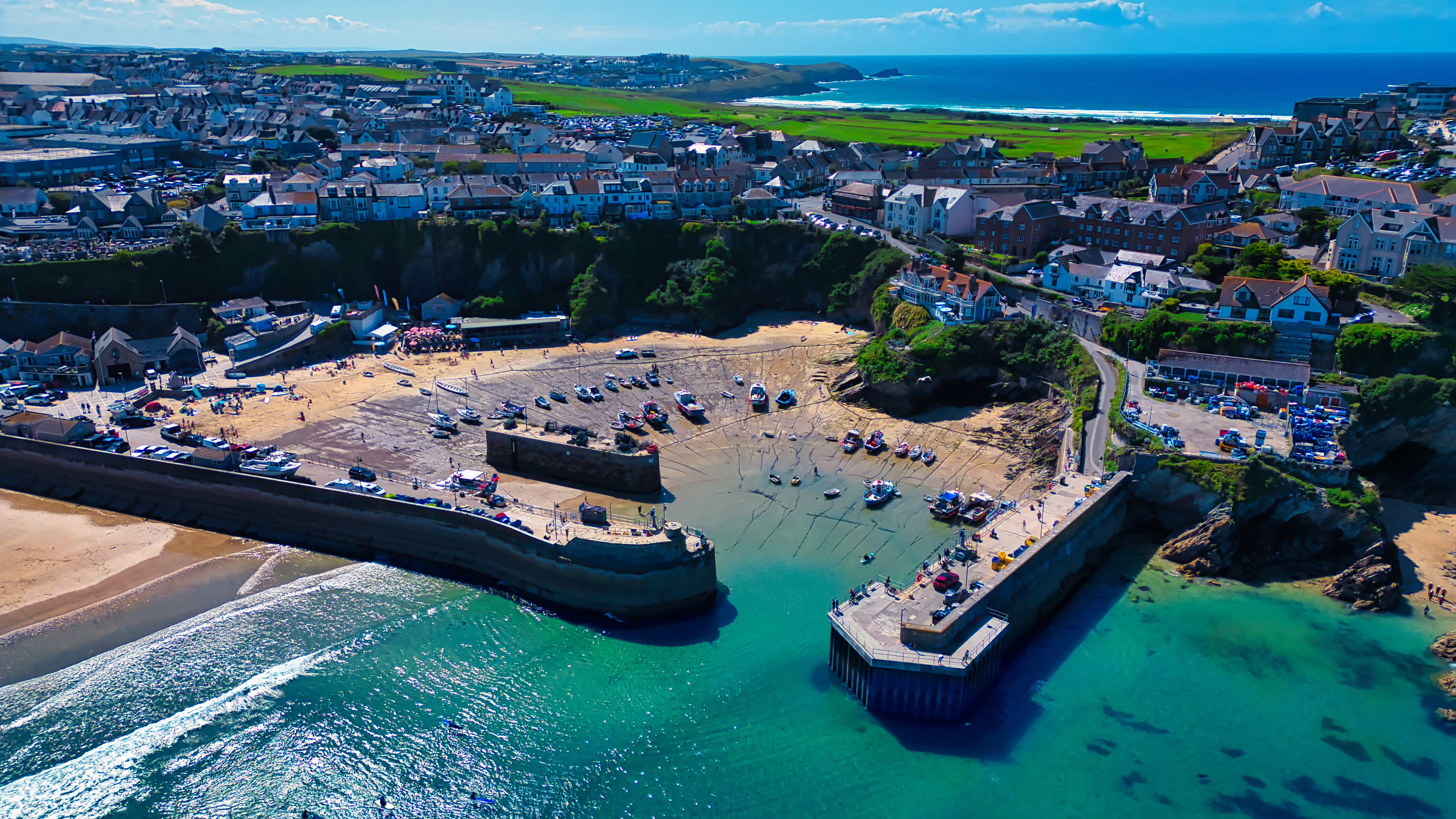 Aerial view of a coastal harbor with sandy beach, boats moored in the water, and a picturesque town in the background. The scene features clear blue skies and lush green fields in the distance, showcasing a vibrant seaside atmosphere.