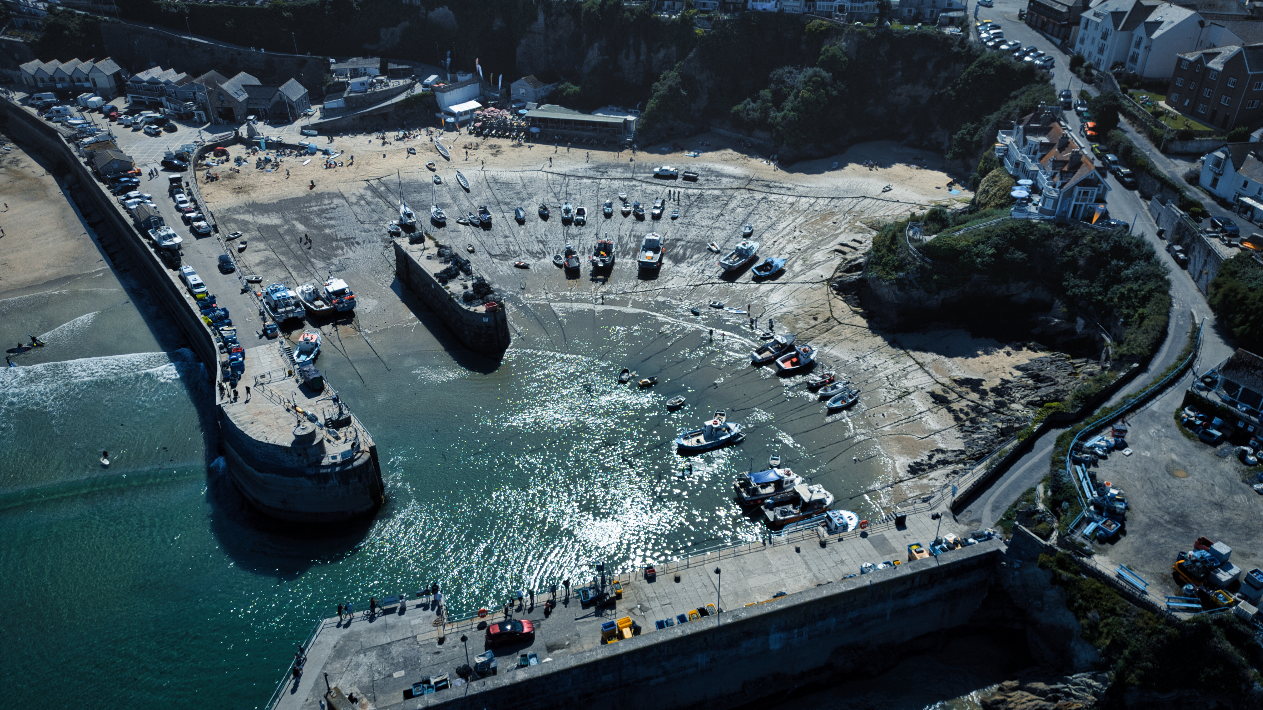 Aerial view of a coastal harbor with boats and a sandy beach. The tide is low, revealing the harbor floor. Various vehicles are parked along the harbor, and buildings are visible on the hillside. The scene captures the tranquil atmosphere of a seaside town.