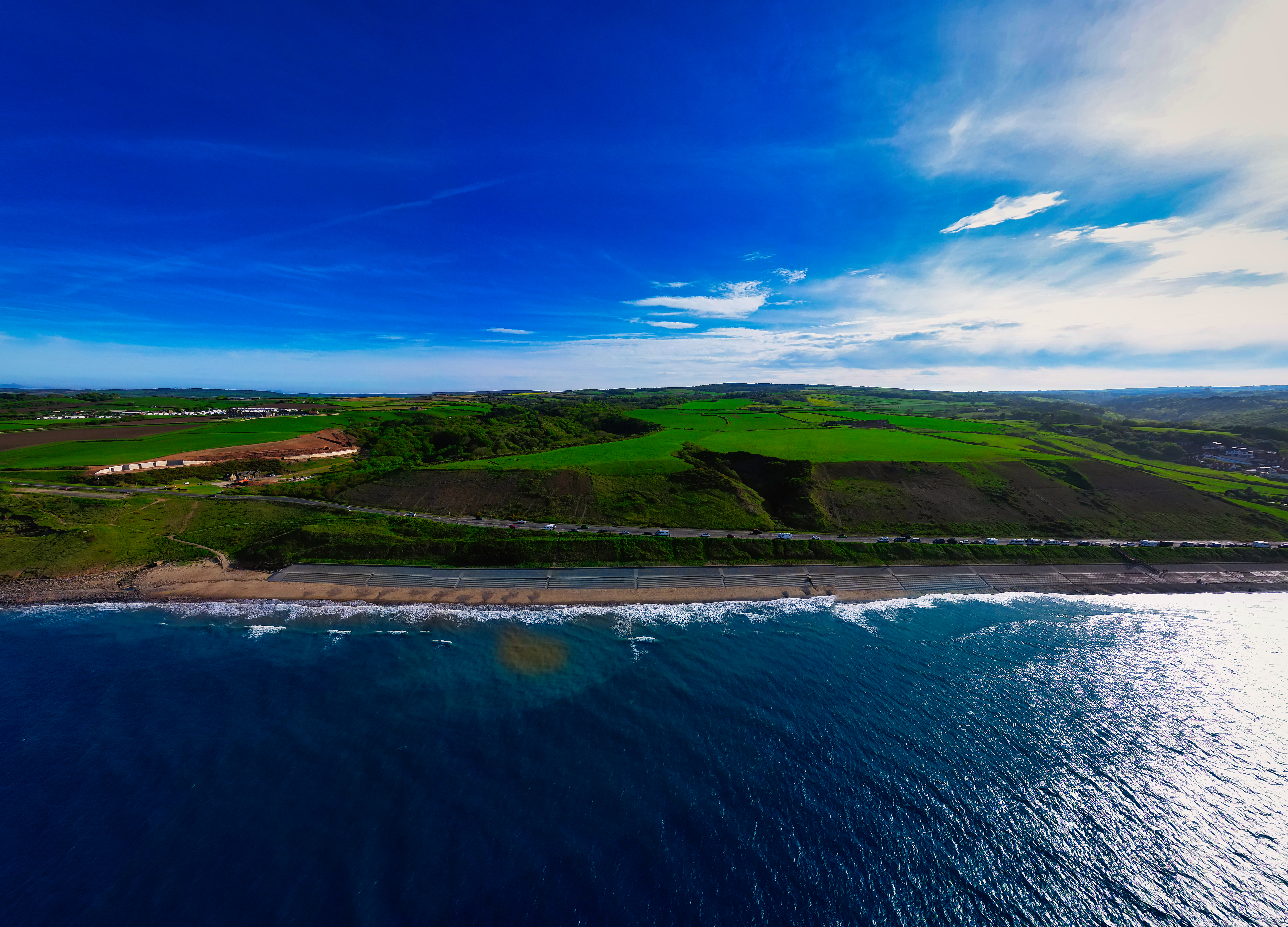 Aerial view of a coastal landscape with a beach, green fields, and a clear blue sky.