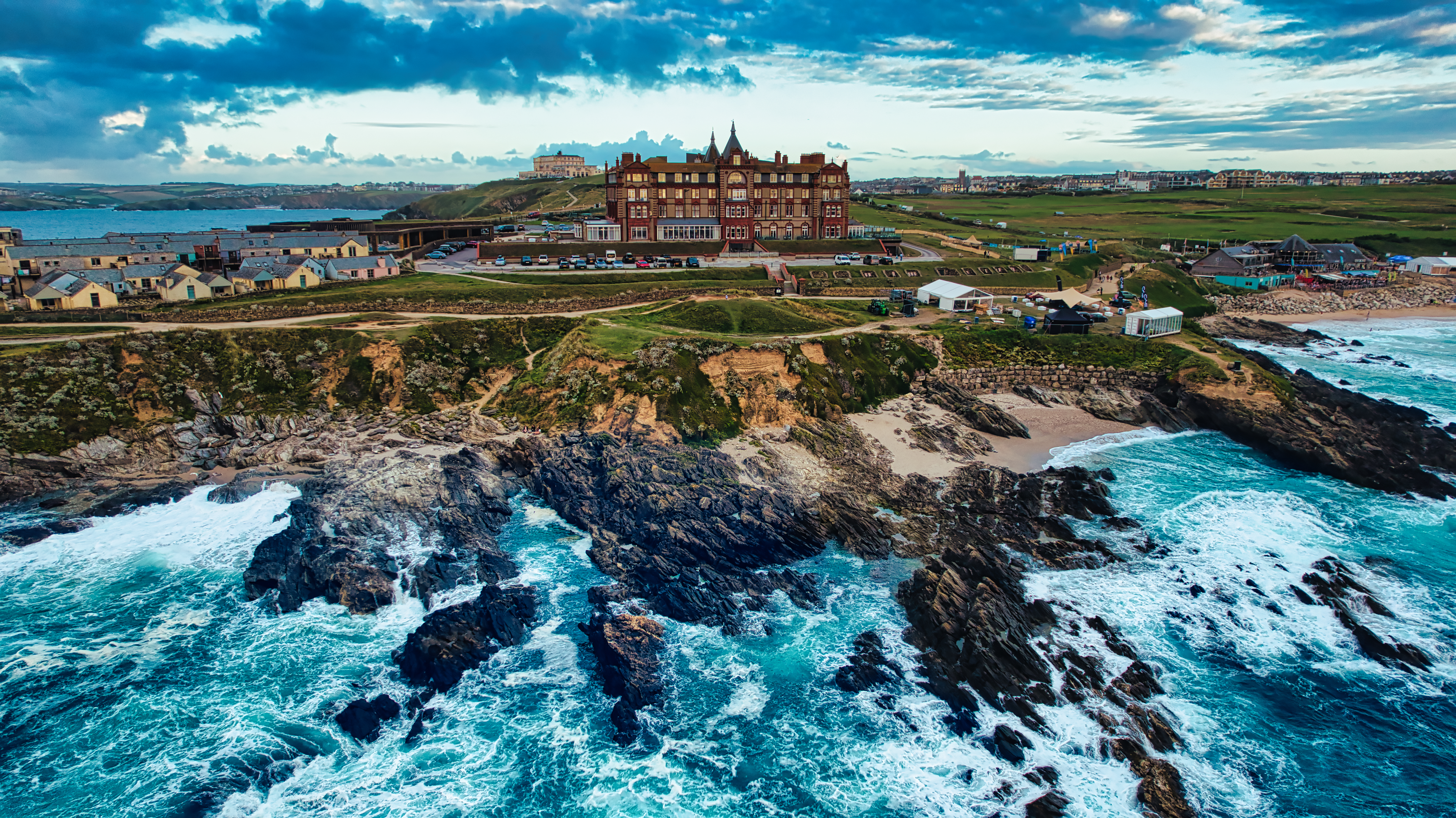 A stunning aerial view of a coastal landscape featuring rocky shores and crashing waves. In the background, a large historic building stands prominently, surrounded by green hills and a blue sky with scattered clouds. The scene captures the beauty of nature and architecture by the sea.