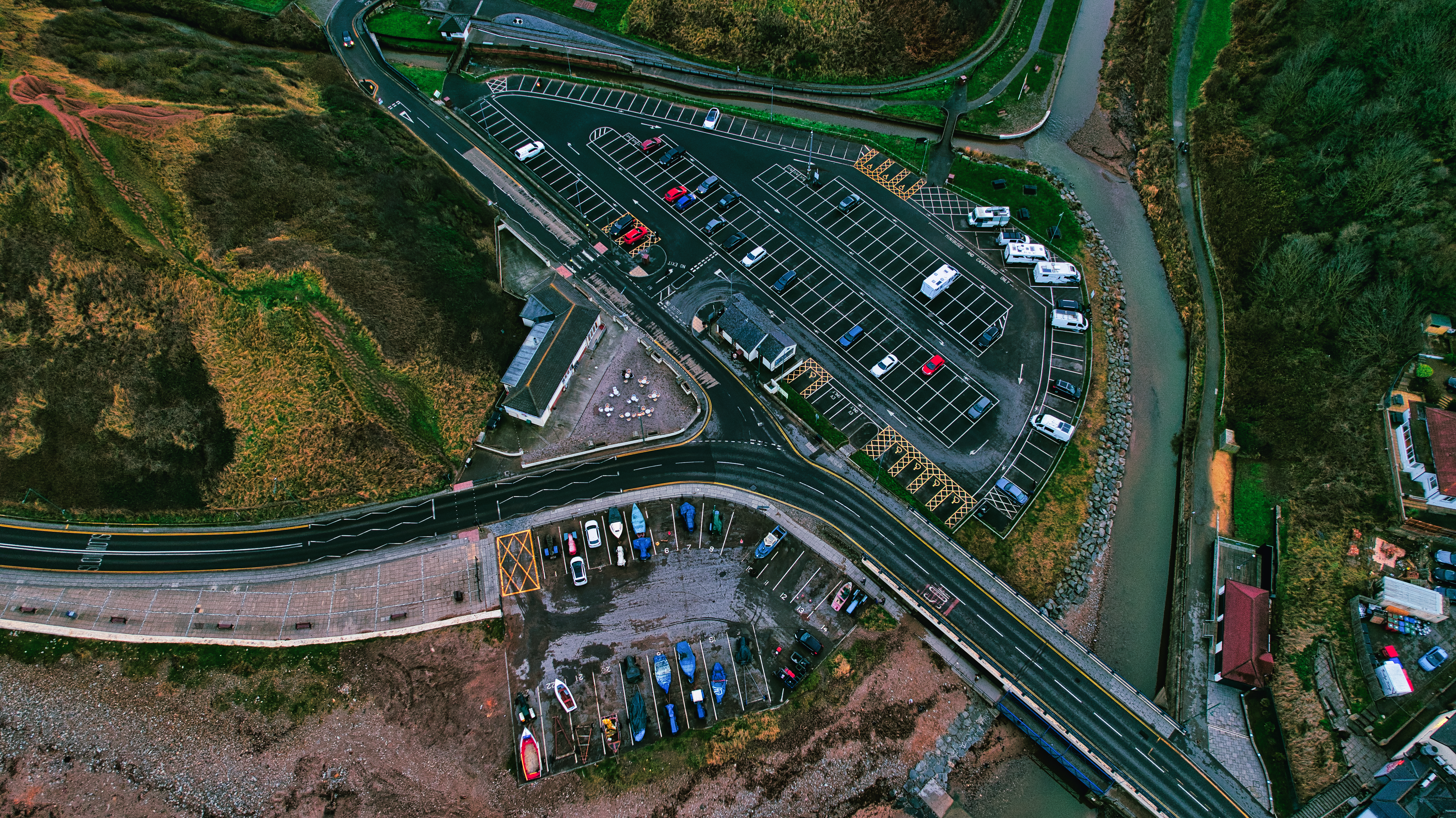 Aerial view of a coastal parking area with cars, boats, and a small river. Roads and grassy hillsides surround the parking lots. Buildings are visible near the river and parking areas in Saltburn by the Sea