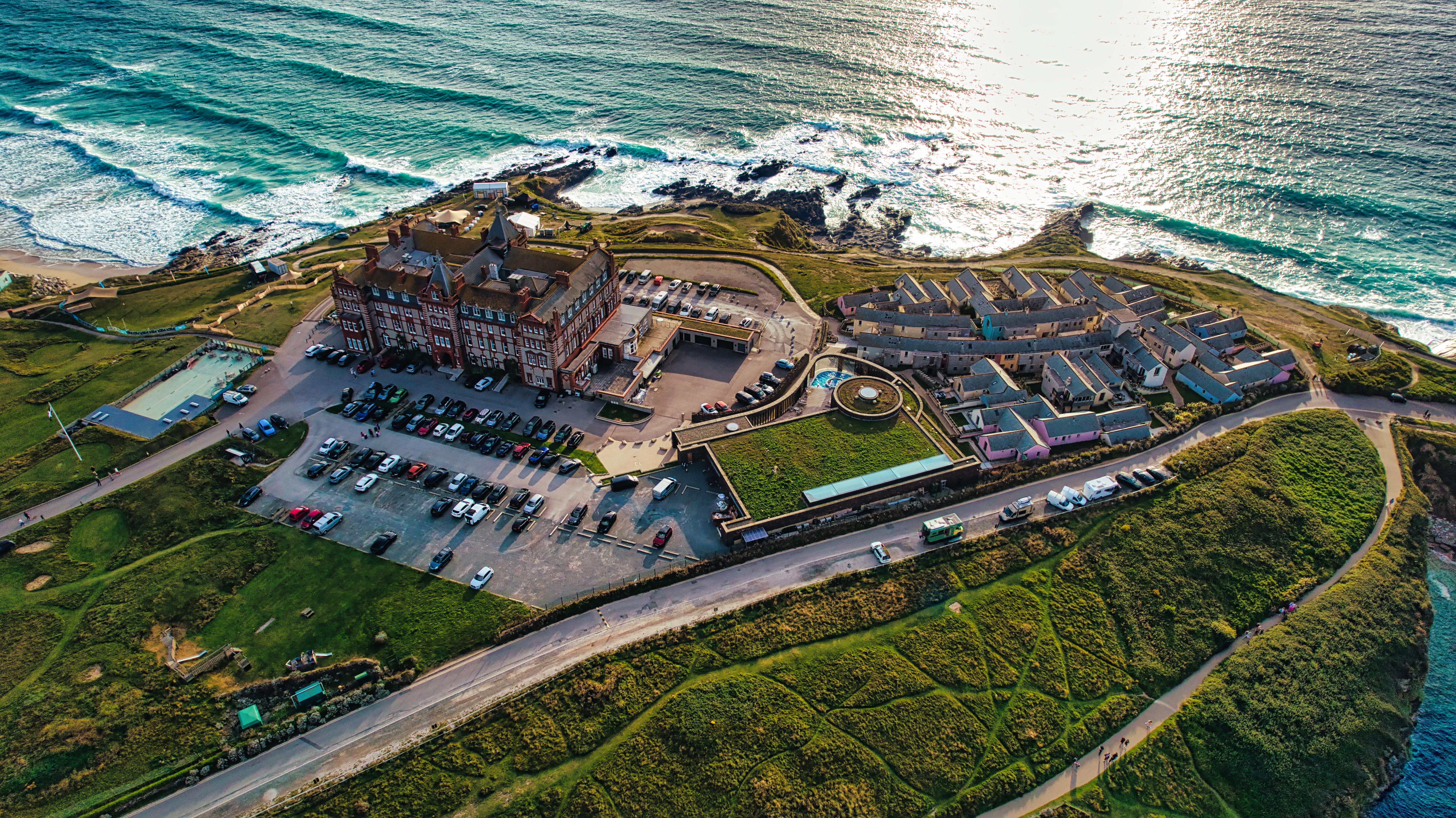 Aerial view of a coastal resort with a large hotel and surrounding buildings. The hotel features a red brick facade and is situated near the ocean, with waves crashing on the rocks below. The area includes a parking lot filled with cars and green grassy spaces.