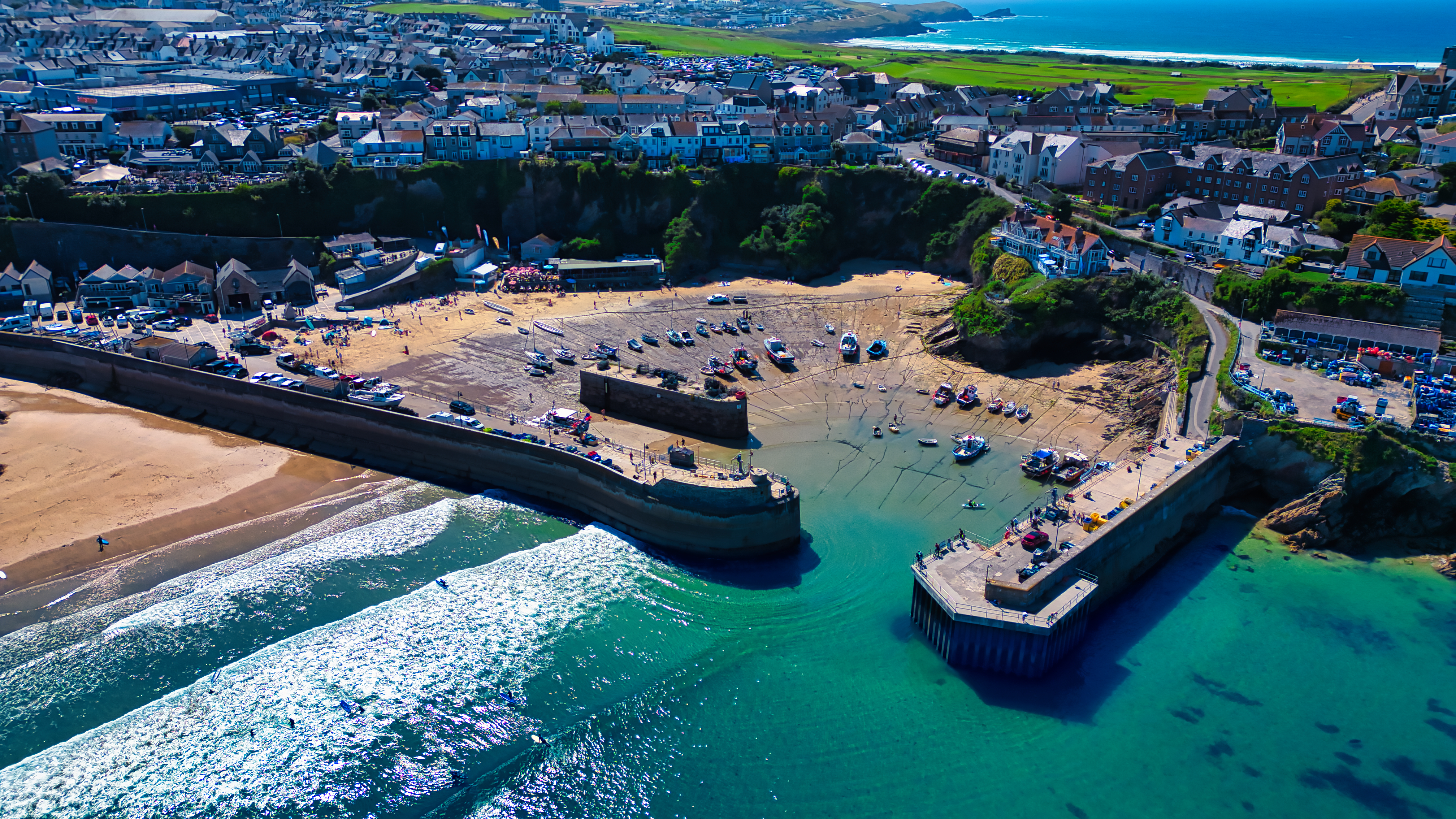 Aerial view of a coastal town featuring a sandy beach, harbor, and parked boats. The scene showcases a mix of residential buildings and commercial establishments along the waterfront, with green fields in the background and clear blue waters.