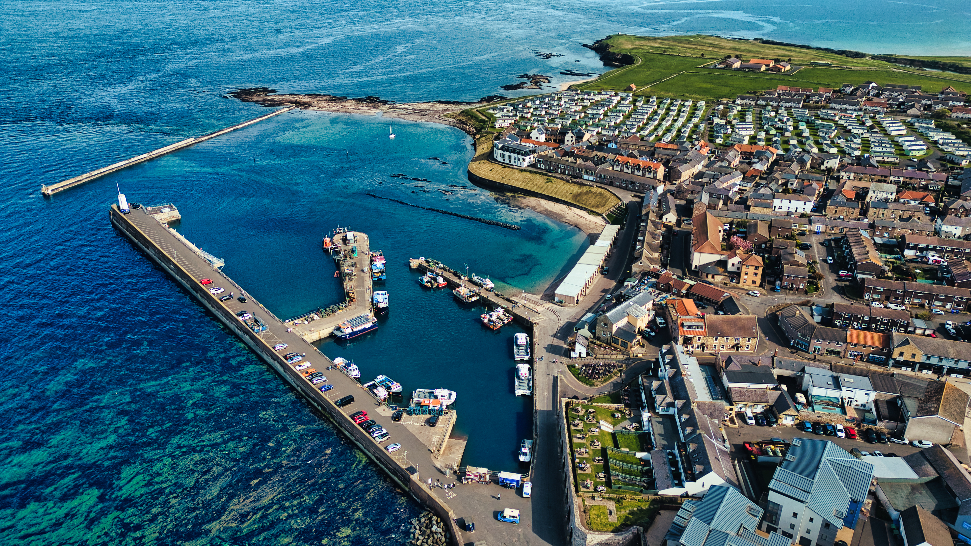 Aerial view of a coastal town with a harbor, breakwater, boats, houses, and a green headland extending into the blue ocean in Seahouses village, UK.