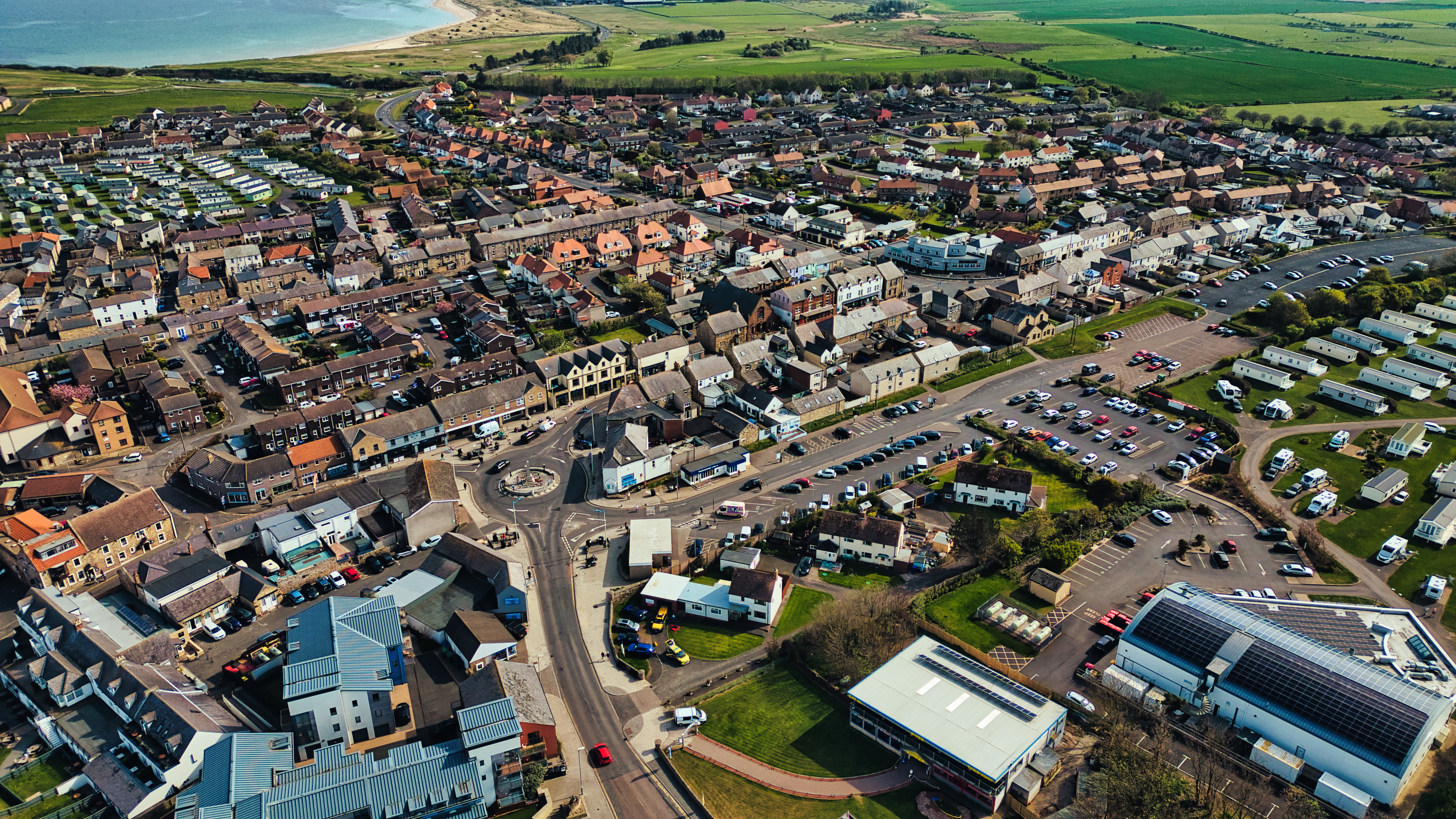 Aerial view of a coastal town with houses, roads, a parking lot with cars and trailers, and green fields leading to a beach in Seahouses village, UK.