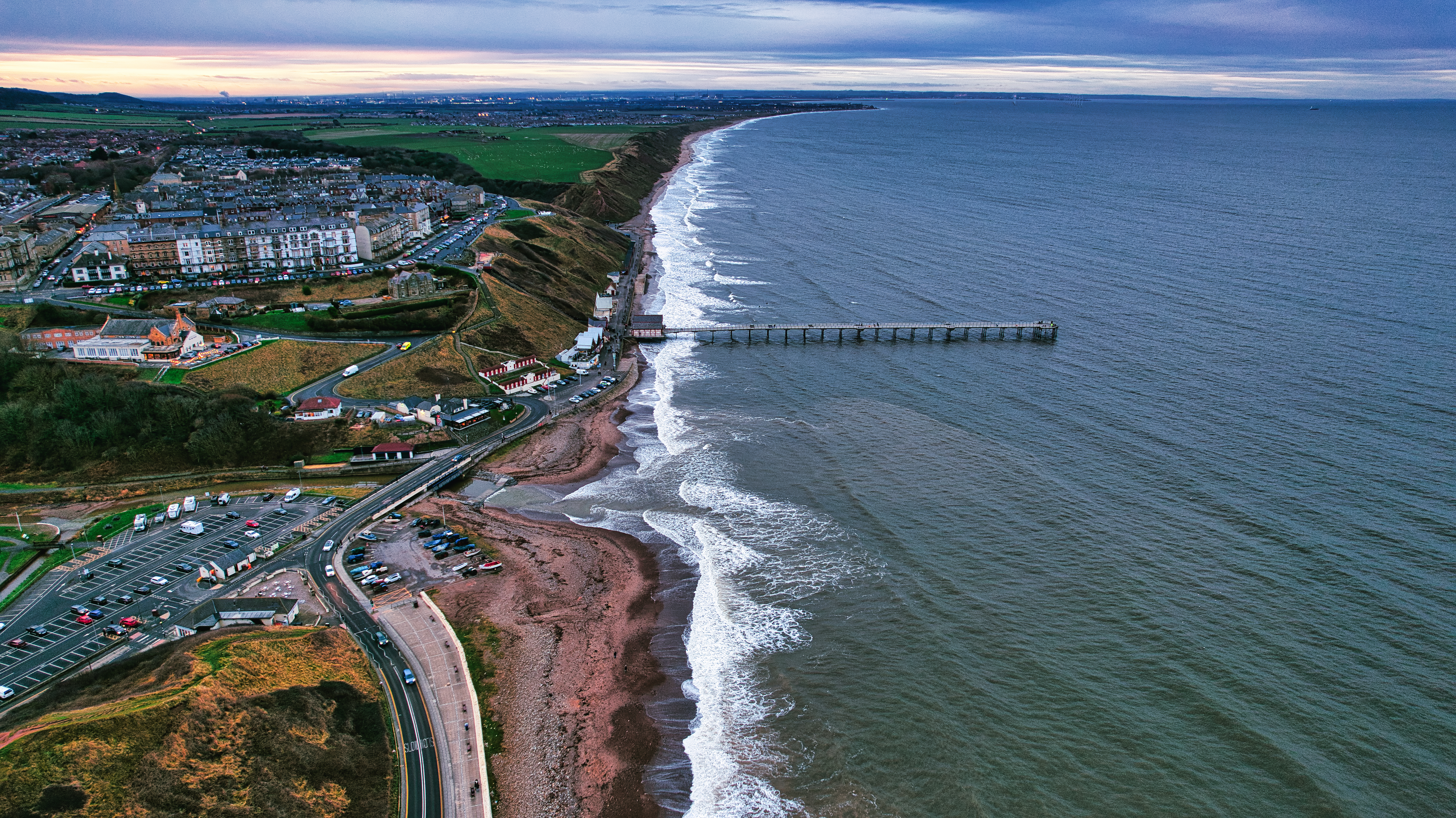 Aerial view of a coastal town, featuring a long pier extending into the sea, a sandy beach with breaking waves, and buildings on a cliffside. Parking lots and roads are visible in Saltburn by the Sea